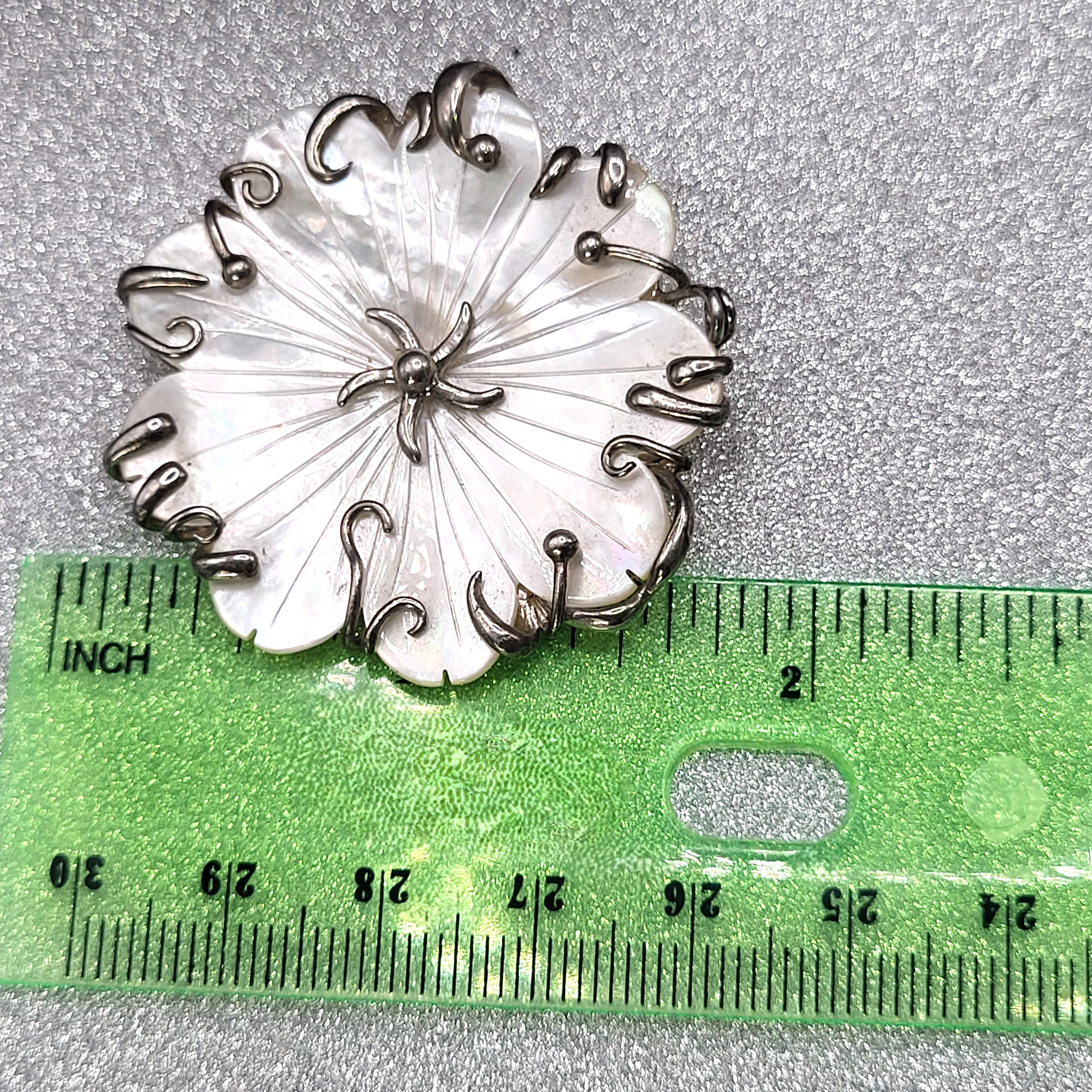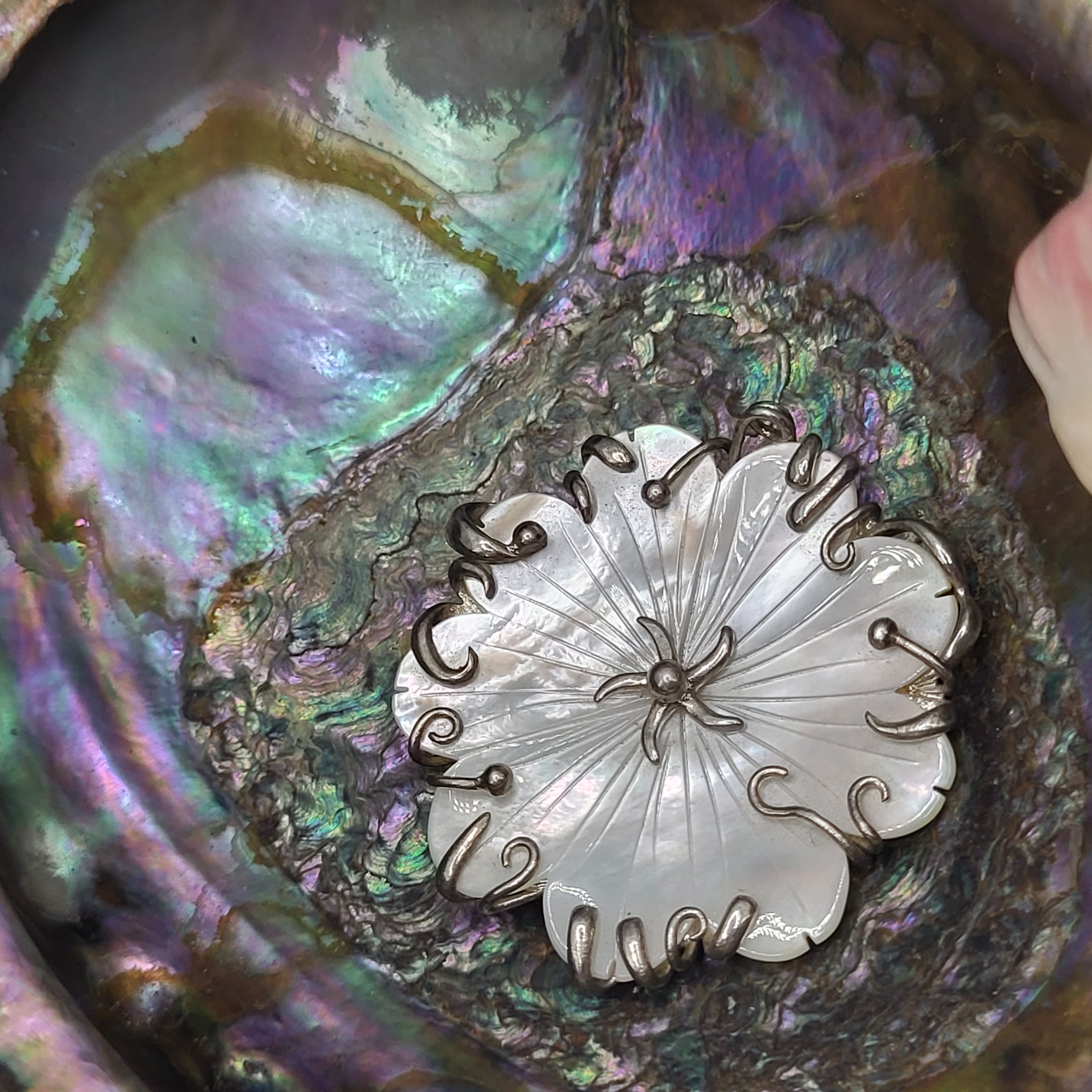 This beautiful sterling silver pendant is delighfully carved into a pansy-like flower design, complete with "nectar guides" in the shimmery petals. The flower is complete with a sterling silver stigma in the center. Graceful sterling silver ‘tendrils’ gather along the edges of the flower petals. This lovely flower is equipped with an ample sterling silver hidden bail that can accommodate an approximate 5mm wide chain. Admin Code: KJISB/lr