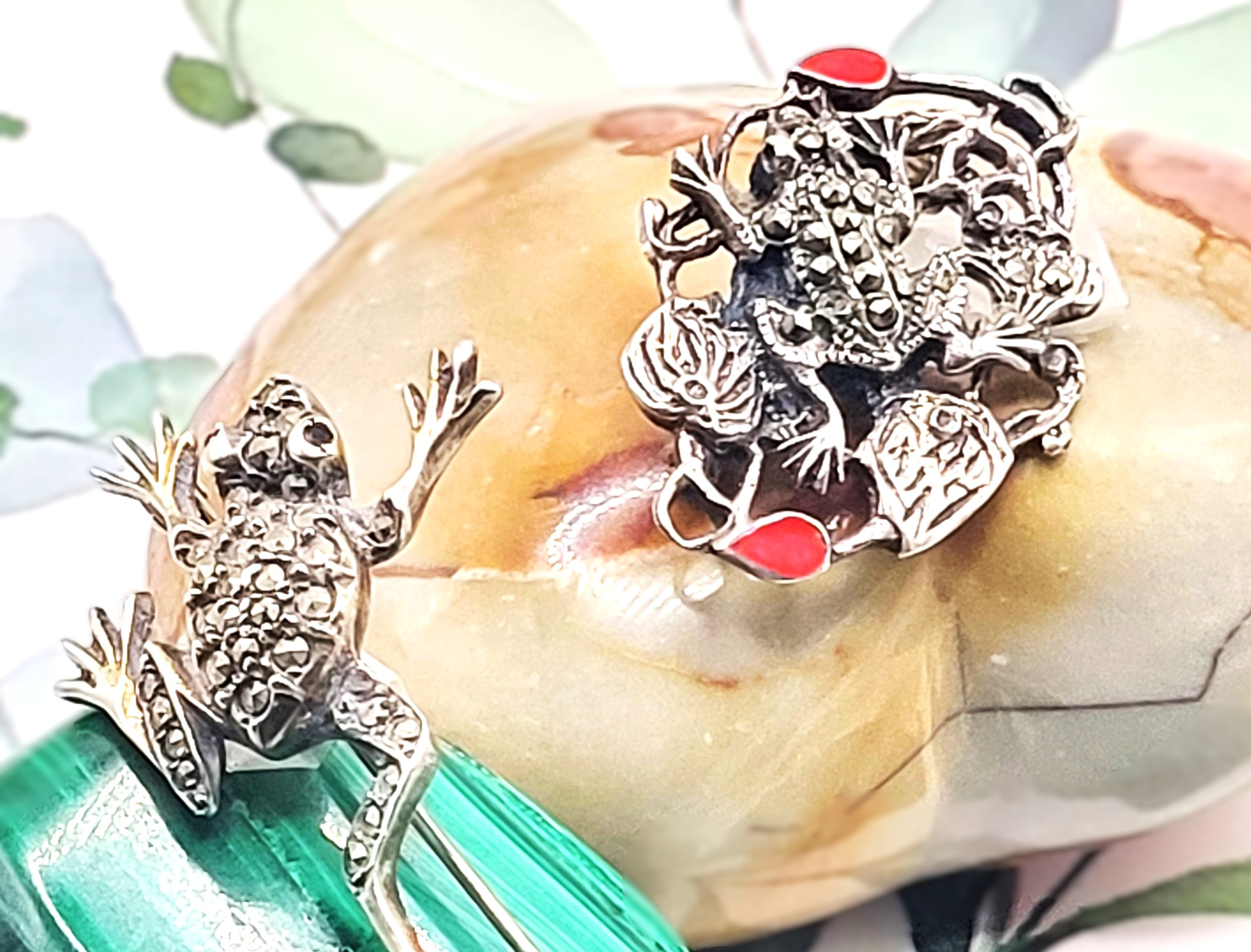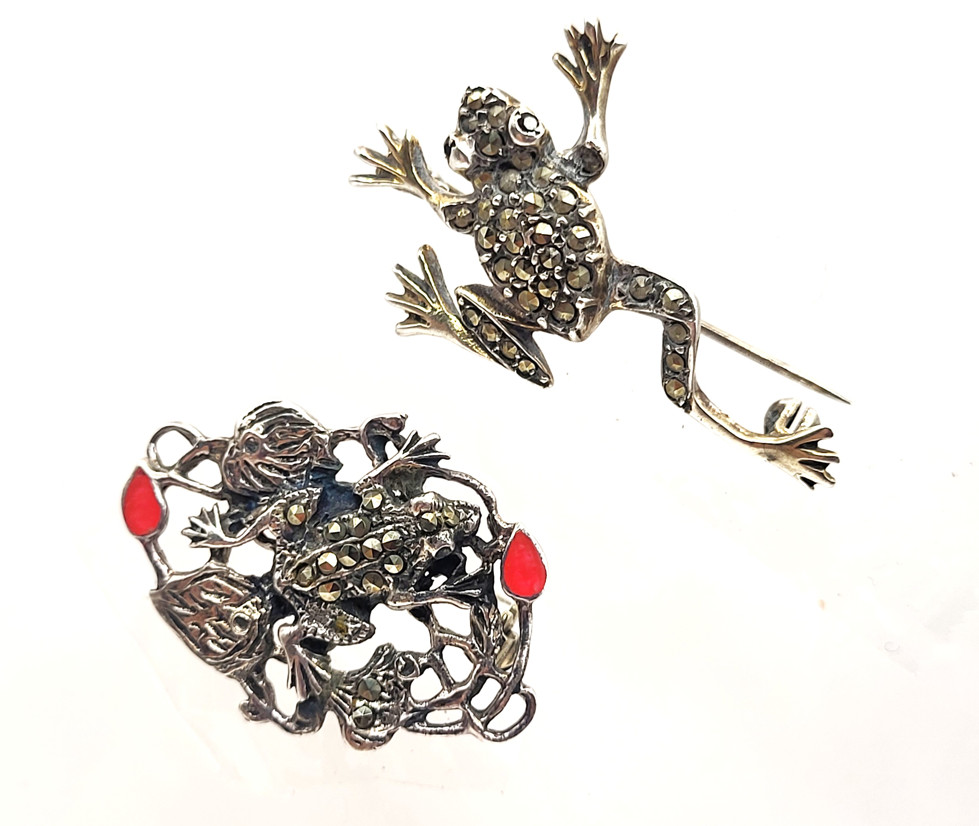 These brooches are made of sterling silver and adorned with marcasites. One brooch is additionally adorned with orange enamel. The enamel frog with lily pads is stamped .925. The "climbing" frog is stamped "Sterling" and "Germany". Both have locking "C" clasp closures. Admin: 33120/25bl 300026G