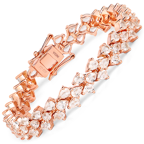 This sterling silver bracelet has 83 pear-cut, 4x3mm, pear-cut, genuine Morganite that total 10.79 carats and are set asymmetrically with 2 gems in one row, and one in the next, continually for 7". The bracelet is approximately 3/8" wide. It has a 14 karat rose gold finish to compliment the peachy-pink, prong-set Morganites and it closes with a hidden box clasp that is secured with a figure-eight safety clasp. AdminCode: NQnis/lwn3