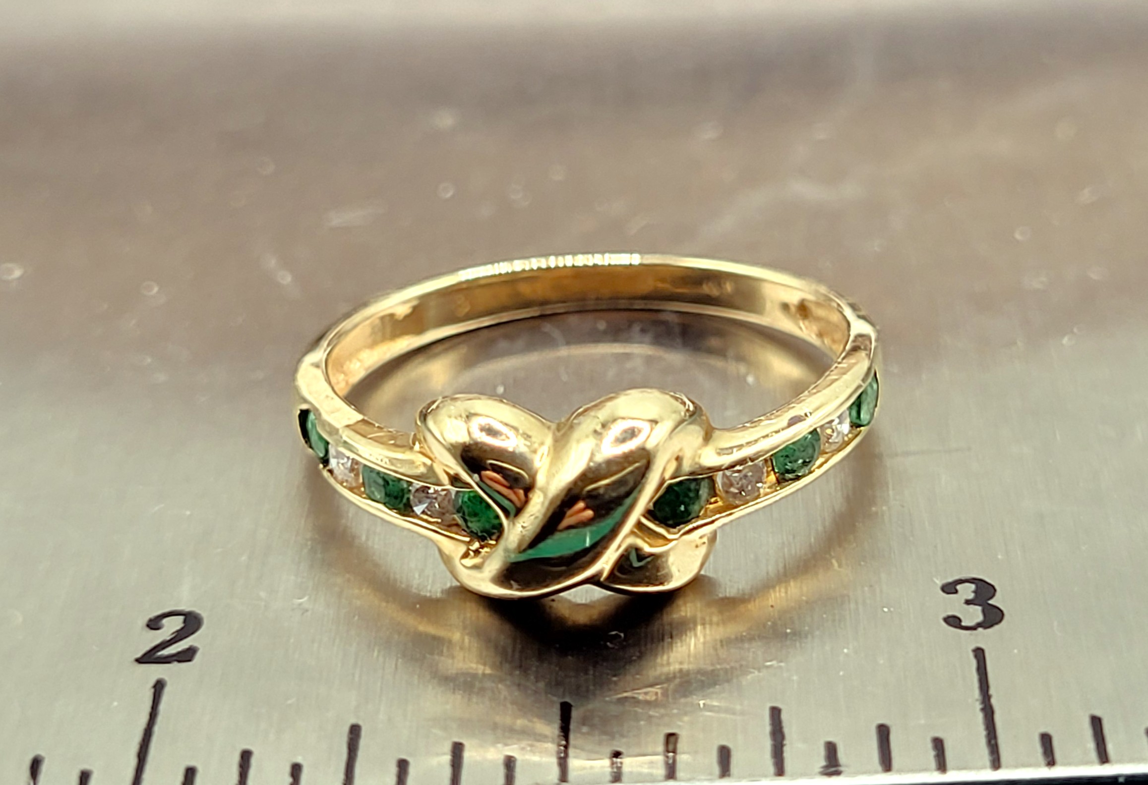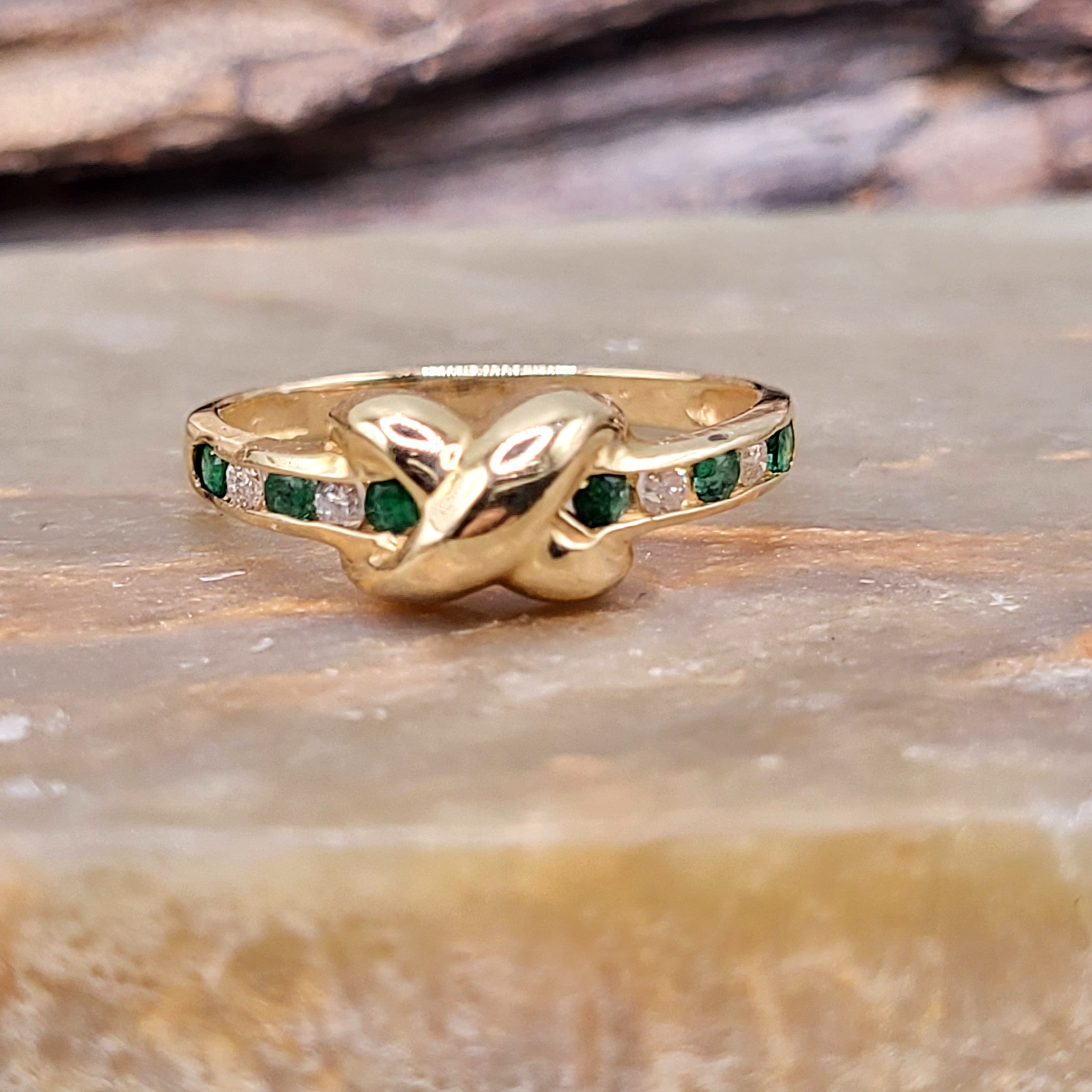 Estimated Retail Value: $1075.00 This is 14 karat yellow gold ring features .25 carats total weight of round, faceted, genuine emeralds and .13 carats total weight of round, brilliant-cut, H-I color, SI2-I1 clarity diamonds is great for stacking. The X-Cross My Heart design gives it the perfect touch of romance. The ring is US size 7. See sizing details and other information below. Admin: G11241/5llt