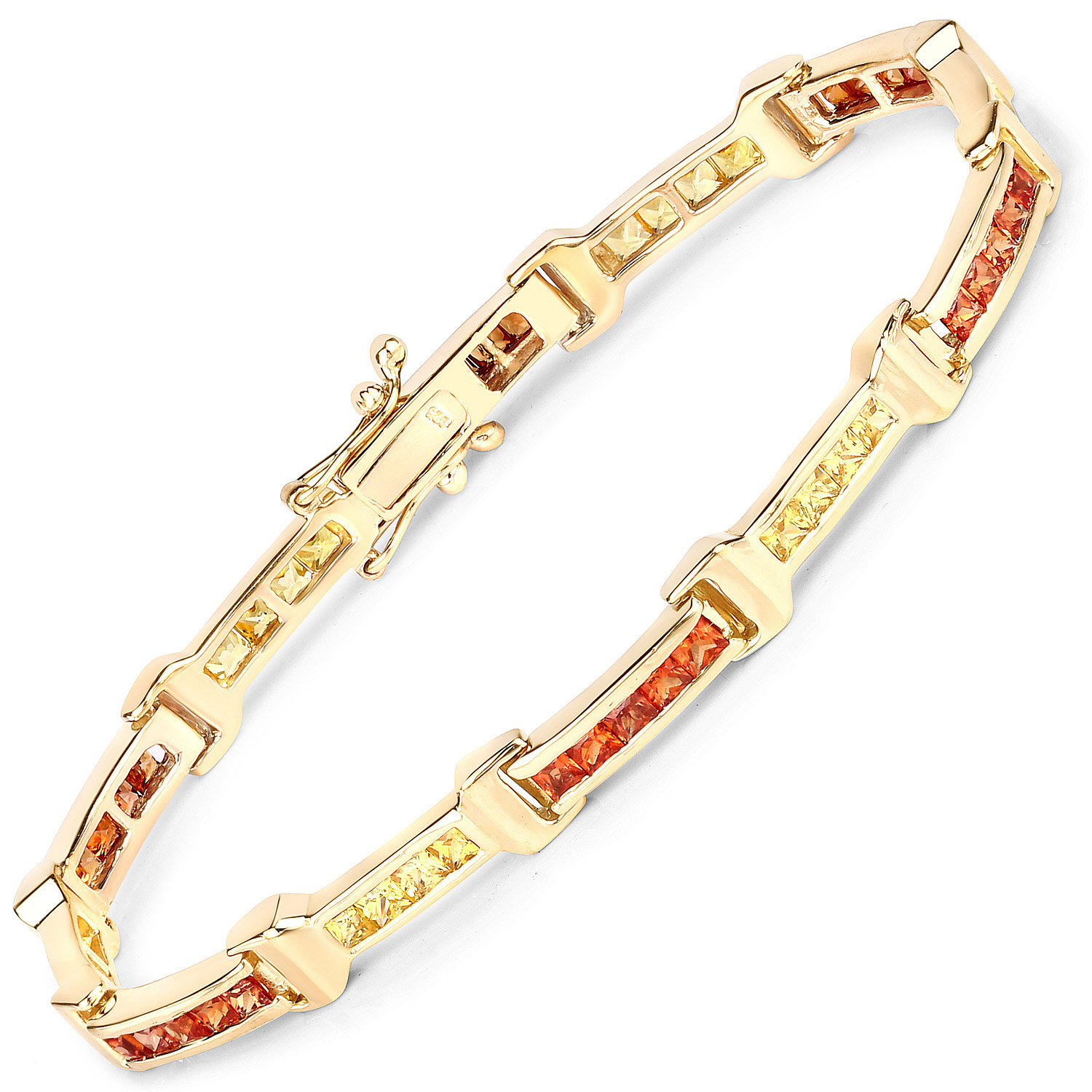 This sterling silver bracelet features 6.48 carats of amazing, genuine fancy sapphires. The are 3.6 carats total weight of 2.5mm, square-cut, channel-set, genuine, orange sapphires, and 2.88 carats total weight of 2.5mm, square-cti channel-set, genuine yellow sapphires. The bracelet is 6.5mm wide, and 7.5" long with a hidden box clasp and 2 safety clips. AdminCode: NQnis/gol4