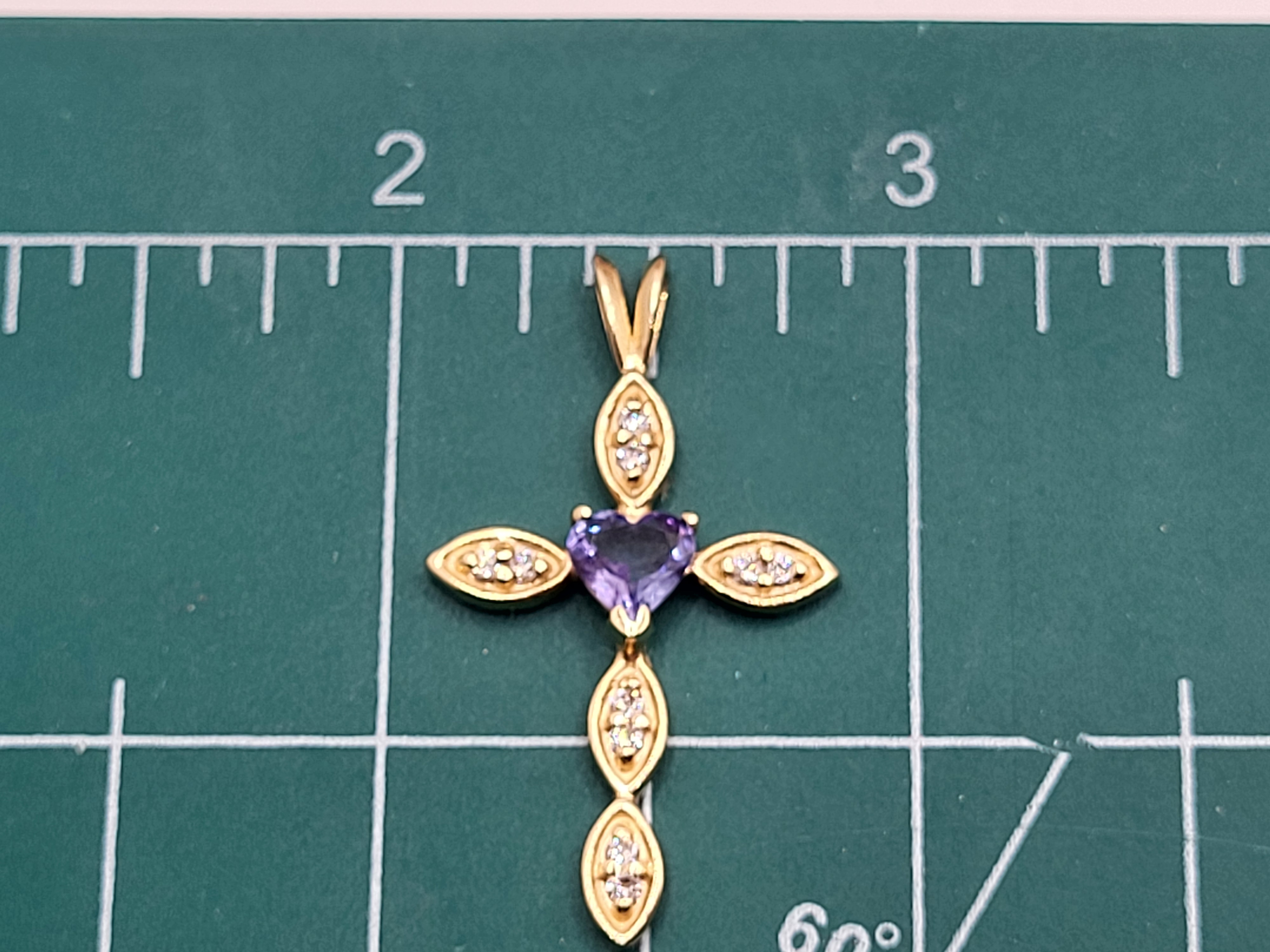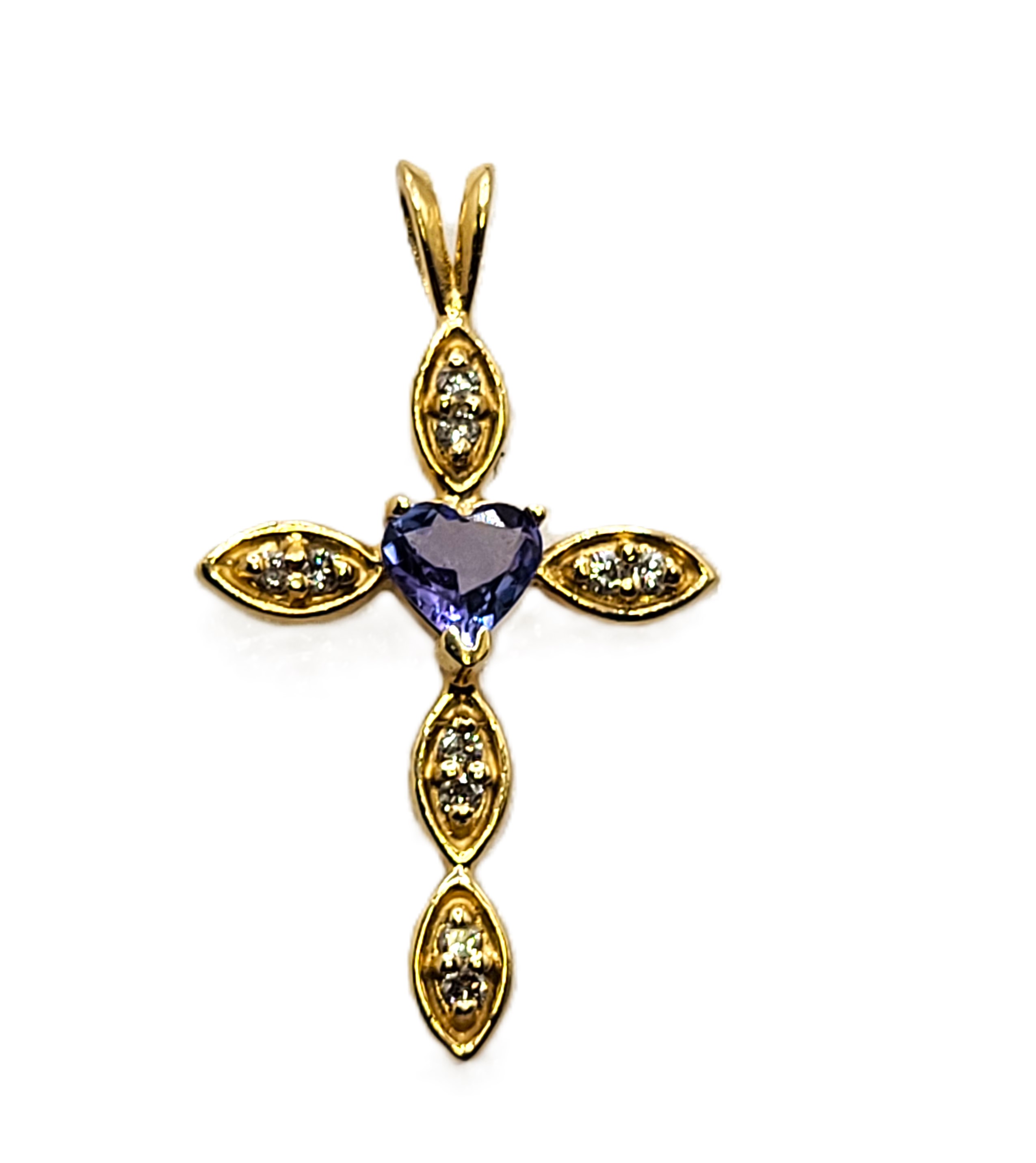 This is a 14 karat yellow gold cross pendant with an approximate .55 carat heart-cut, prong-set, genuine tanzanite and approximately .20 carat total weight of round, brilliant-cut, H, SI2-I1 clarity diamonds on the rail and arms. The cross is approximately 1.25" tall and 7/8" wide and the rabbit ear bail can accommodate an approximate 1.25mm thick chain. Admin: G11241/14ilt