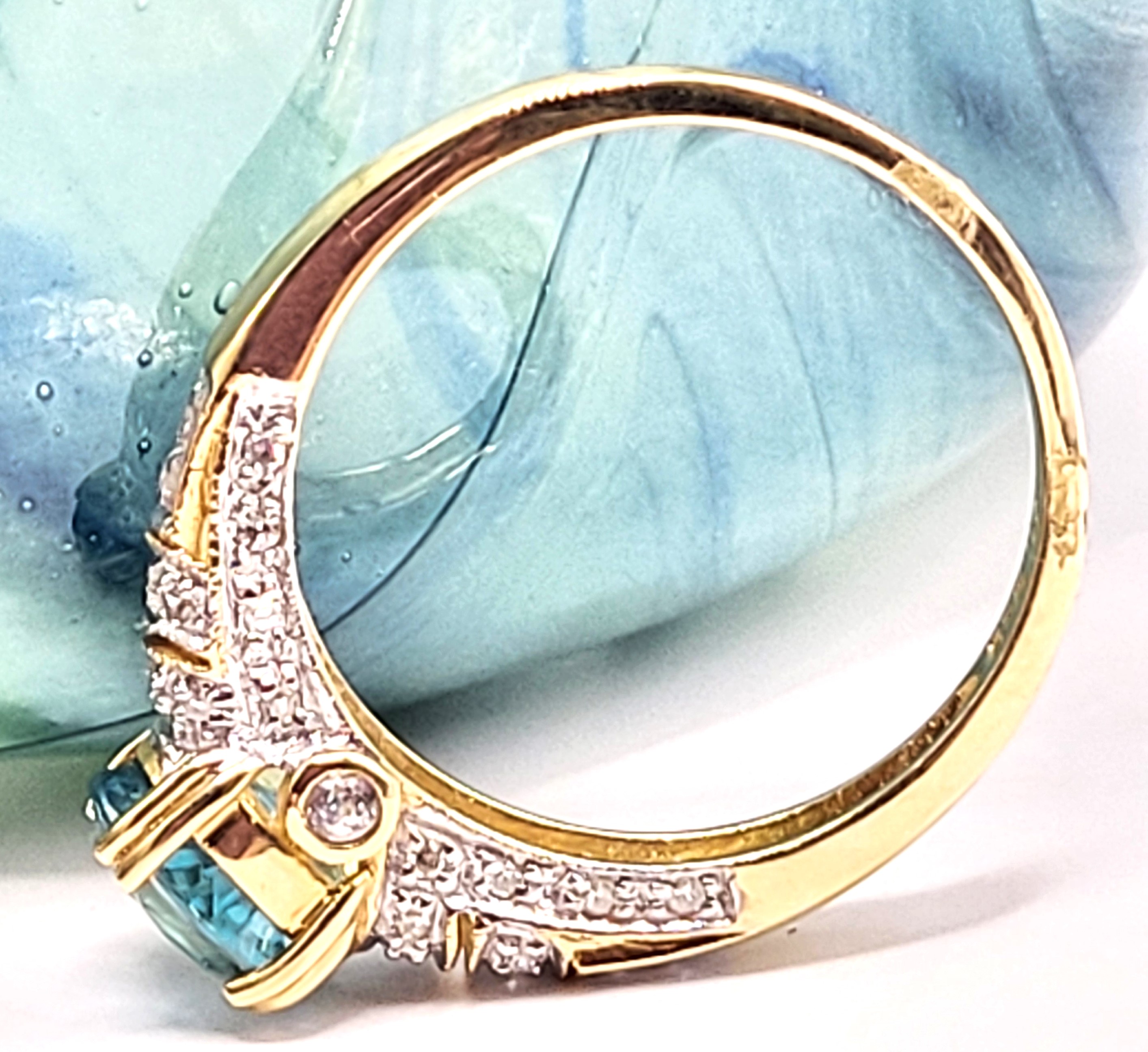 This is a 14 karat yellow gold ring that features a gorgeous oval-cut, East-West set with double prongs, genuine blue zircon, approximately 2.00 carats. There are .25 carats total weight of round, brilliant-cut diamonds in the bridge and along the shoulders. This ring is an approximate US size 10 and can be sized for an additional charge. Please contact Bidfair Fine Jewelry for sizing details.This is a brand new item that has been held in back stock. It is in excellent condition, but may have minor signs of storage, such as fine scratches or patina. 4.15 grams. Admin: 33110/10lh