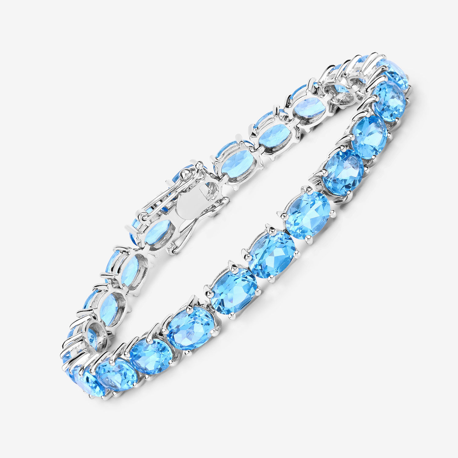 This sterling silver bracelet features 22 oval-cut, 8x6mm, genuine Swiss blue topaz gemstones that are prong-set on hinged links. For added protection, this bracelet has a tarnish-resistant rhodium finish. The bracelet is 7" long and ends with a hidden box clasp and 2 safety clips. AdminCode: NQnis13/irl