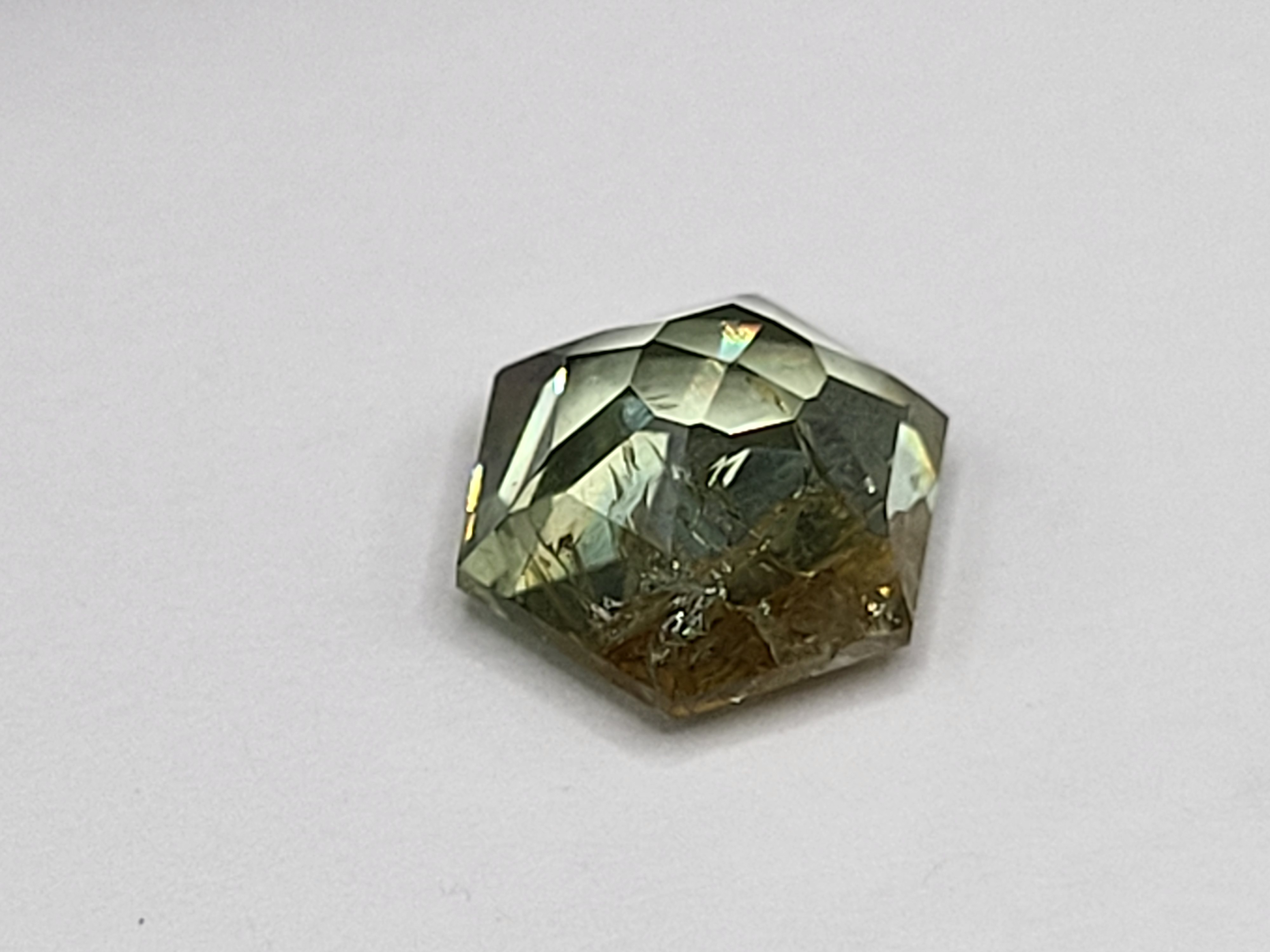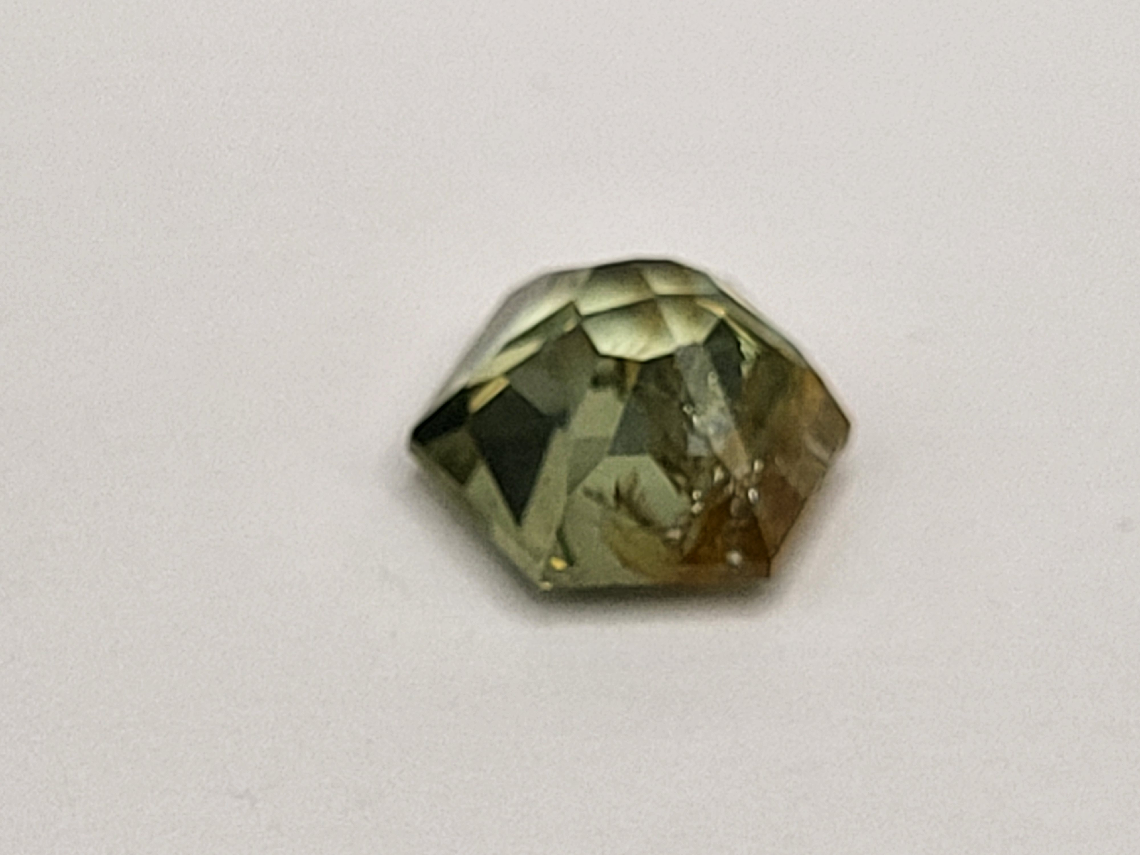 Unheated and unapologetically bold, this 3.25 ct Montana sapphire showcases a striking bi-color blend of yellow and green. Cut into a polygonal form that defies convention, it reflects light with angular confidence and organic depth. The color zoning is deliberate and dramatic—like spring meeting summer in mineral form. With no heat treatment, its natural character remains untouched and incredibly intriguing, making it a gem of geological integrity and visual inspiration. A statement piece for those who favor the unexpected or a fabulous conversation piece for the collector. Admin: BK7/birr