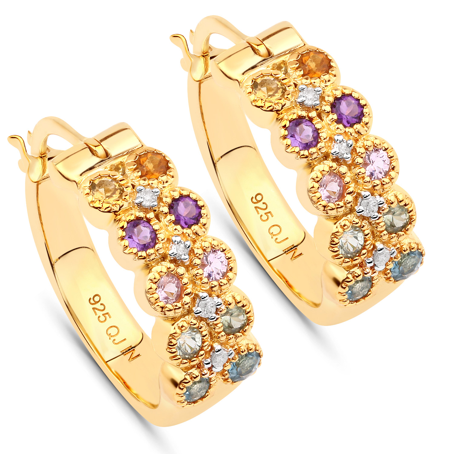 A radiant orbit of color, these gemstone hoops feature natural round stones and are made in .925 sterling silver with a rich 18K yellow gold plated finish. The design features a joyful spectrum of natural round gemstones, including citrine, amethyst, pink sapphire, green sapphire, London blue topaz, Swiss blue topaz, and white diamonds. The gemstones total 0.71 carats, with an additional 0.05ctw of natural round white diamonds adding sparkle and contrast. Each stone is set in secure bezel settings, creating a smooth, modern profile. These hoops fasten with posts and clip‑on backs, offering both security and comfort. A cosmic swirl of color and light that brings instant brightness to any collection. AdminCode: NQnis/bbe10