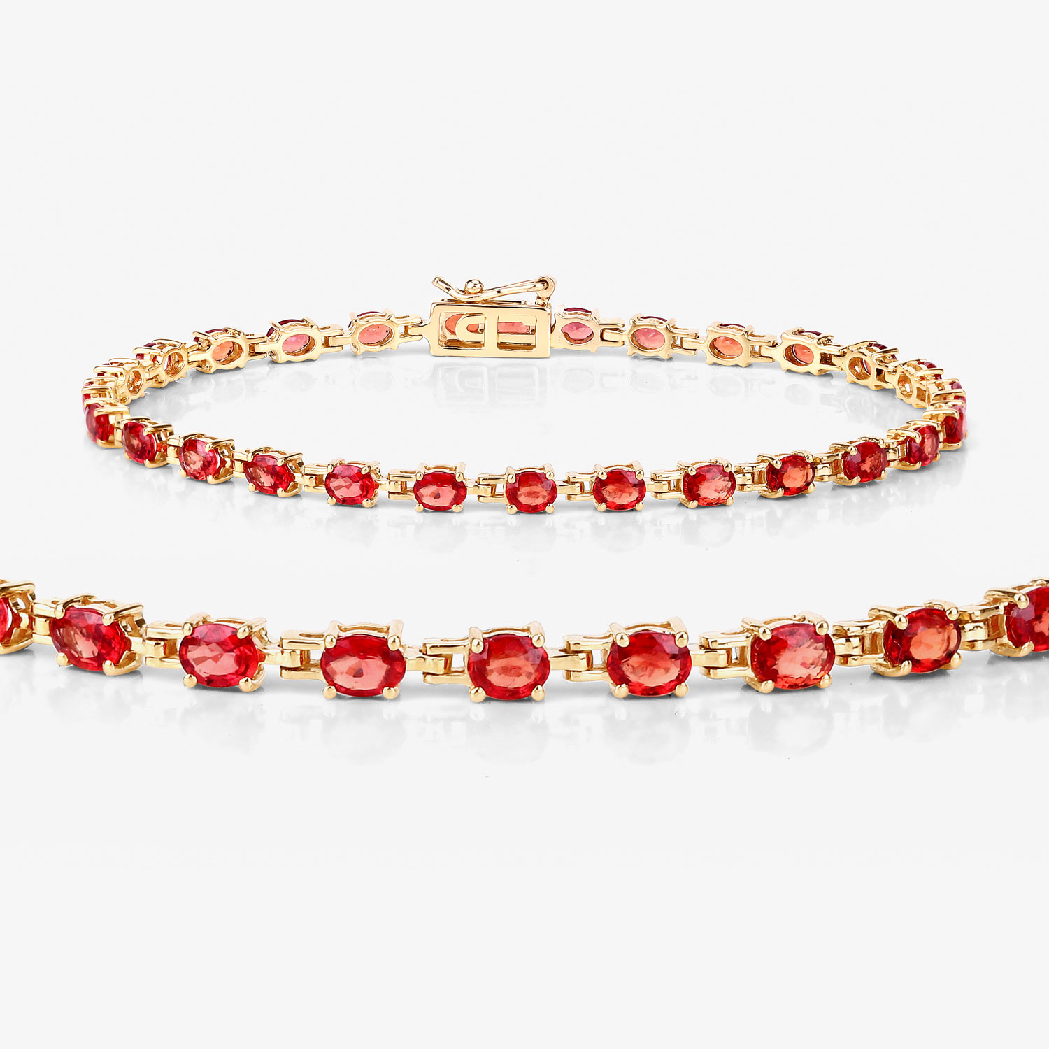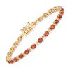 This amazing 14 karat yellow gold bracelet features 7.00 carats of intense, reddish-orange, round, faceted, genuine sapphires. The sapphires are prong-set on dedicated links, making for a flexible bracelet that ends with a hidden box clasp with a figure 8 safety clip.
