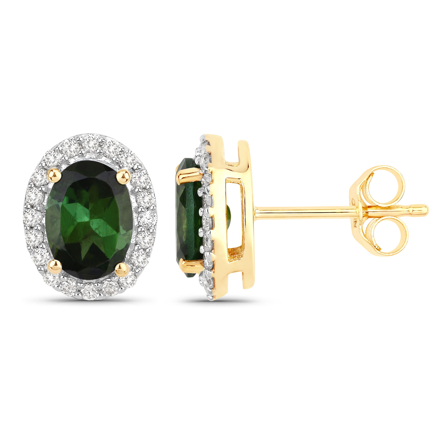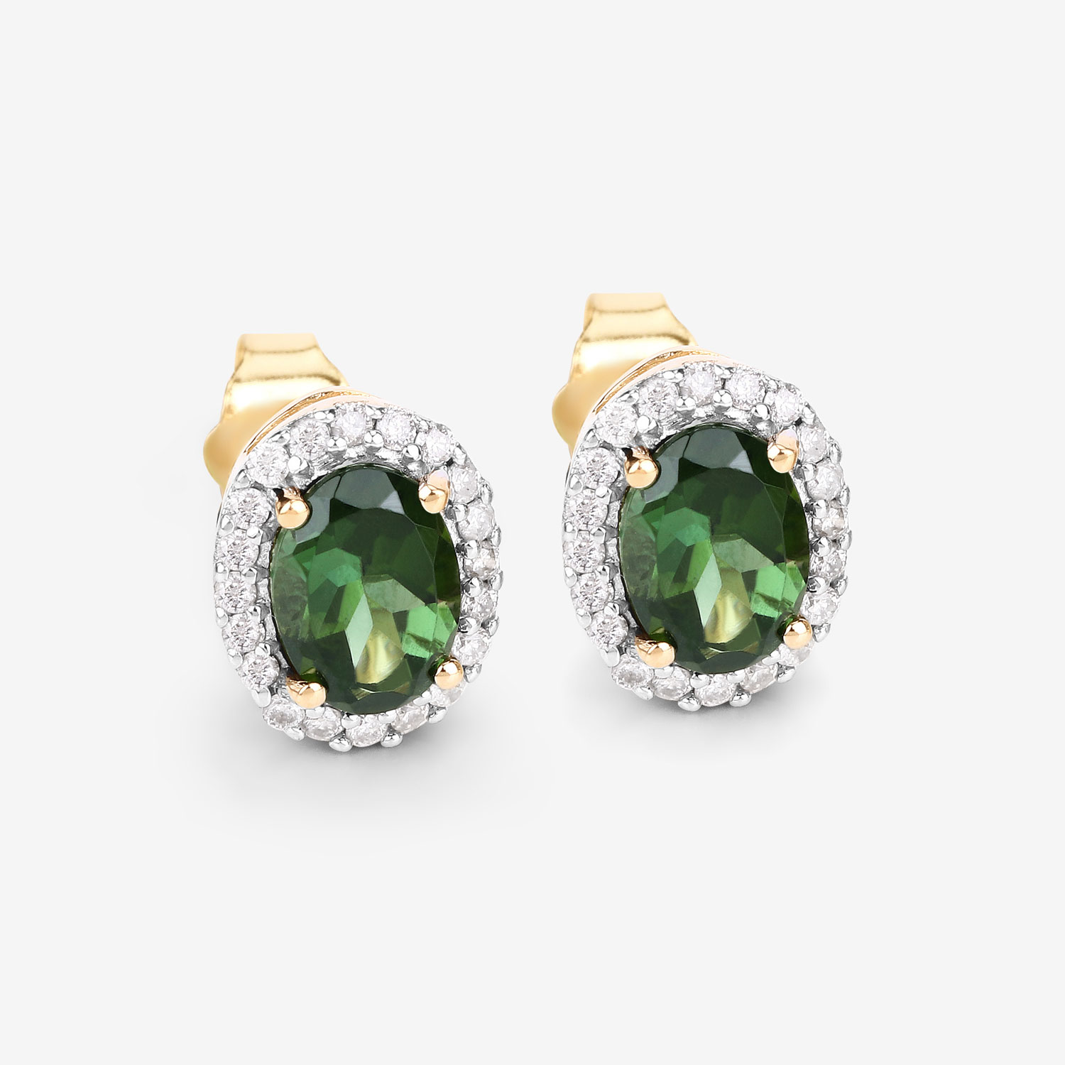 Elegant and vibrant, these halo stud earrings feature natural forest‑green tourmalines totaling 1.66 ctw, each cut in a classic 7x5mm oval. The rich green centers are framed by a sparkling halo of natural white diamonds (0.26 ctw, H–I color, I1 clarity), creating a bright, eye‑catching contrast.
