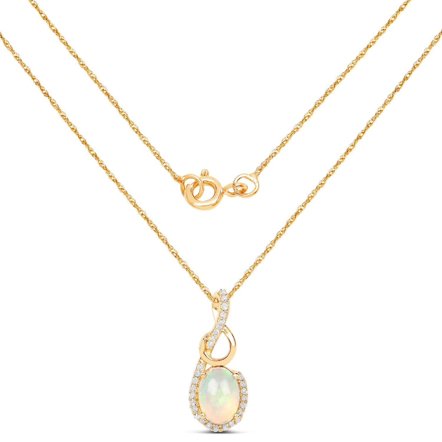 This 14 karat yellow gold necklace shows off a beautiful .48 carat, oval, genuine Ethiopian opal. It is prong-set in a swirl of .08 carats round, faceted, H-I color, I1 clarity diamonds. The pendant has a built-in bail and hangs from an 18" fine link chain that is 14K yellow gold and has a spring ring clasp. See more info below. AdimCode: NQnis/lwn3