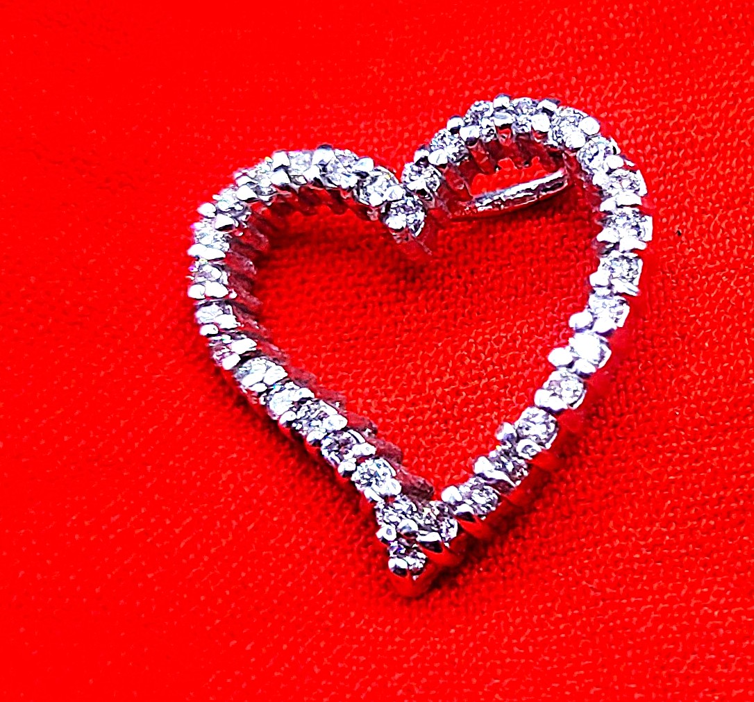 This is a 14 karat white gold heart-shaped pendant, set with .66 carats of round, brilliant-cut, I color, SI2-I1 clarity diamonds and two hidden bails that can accommodate an approximate 2.75mm wide chain. The heart is approximately 3/4" in diameter and has a curved sway and open center. This is a pendant only and does NOT include a chain. 2.96 grams Admin: G11241/16ett