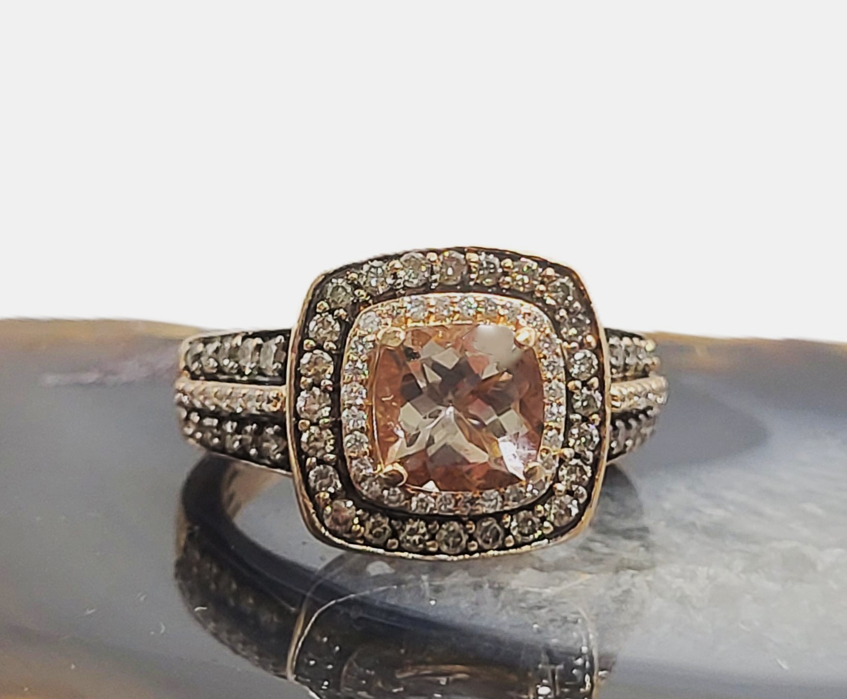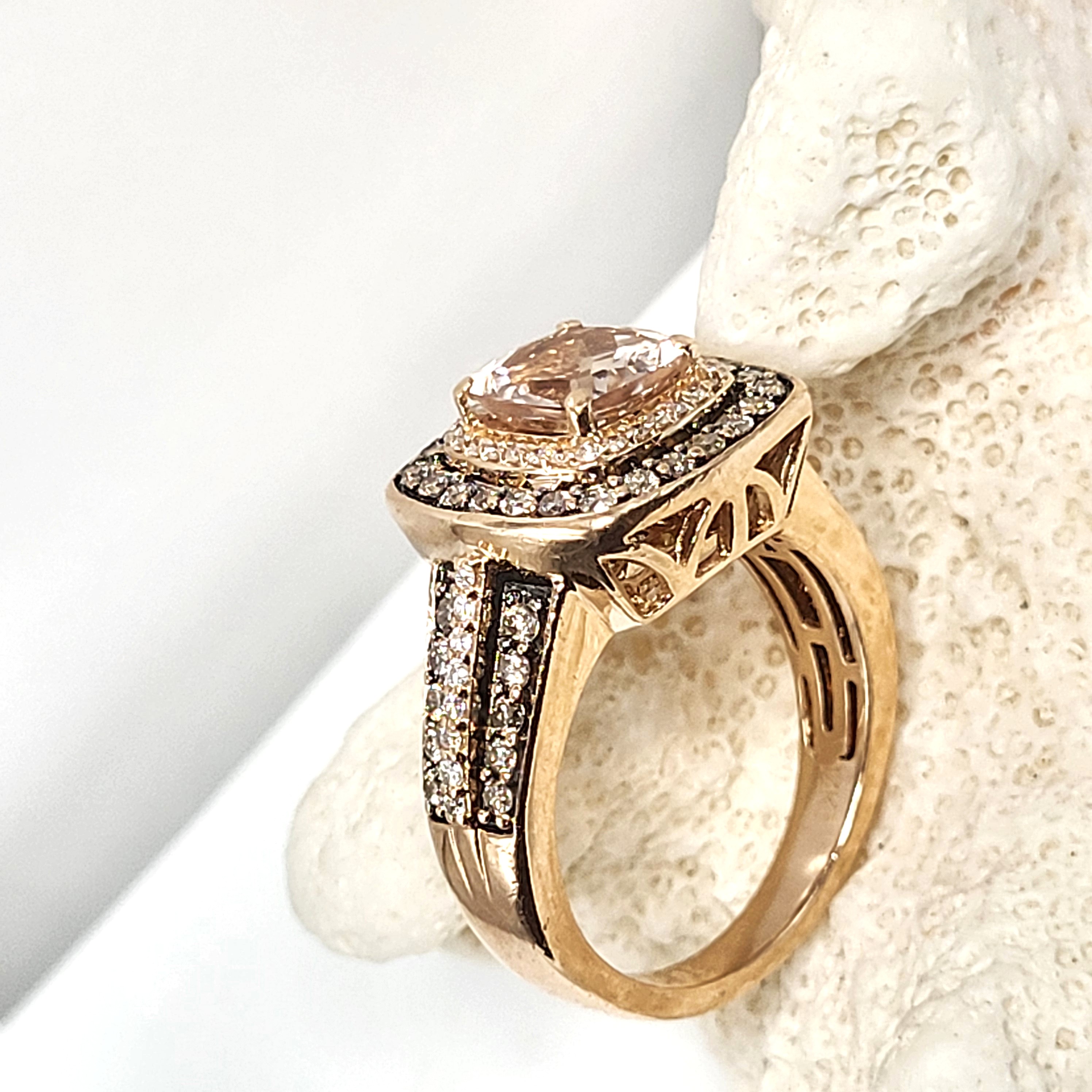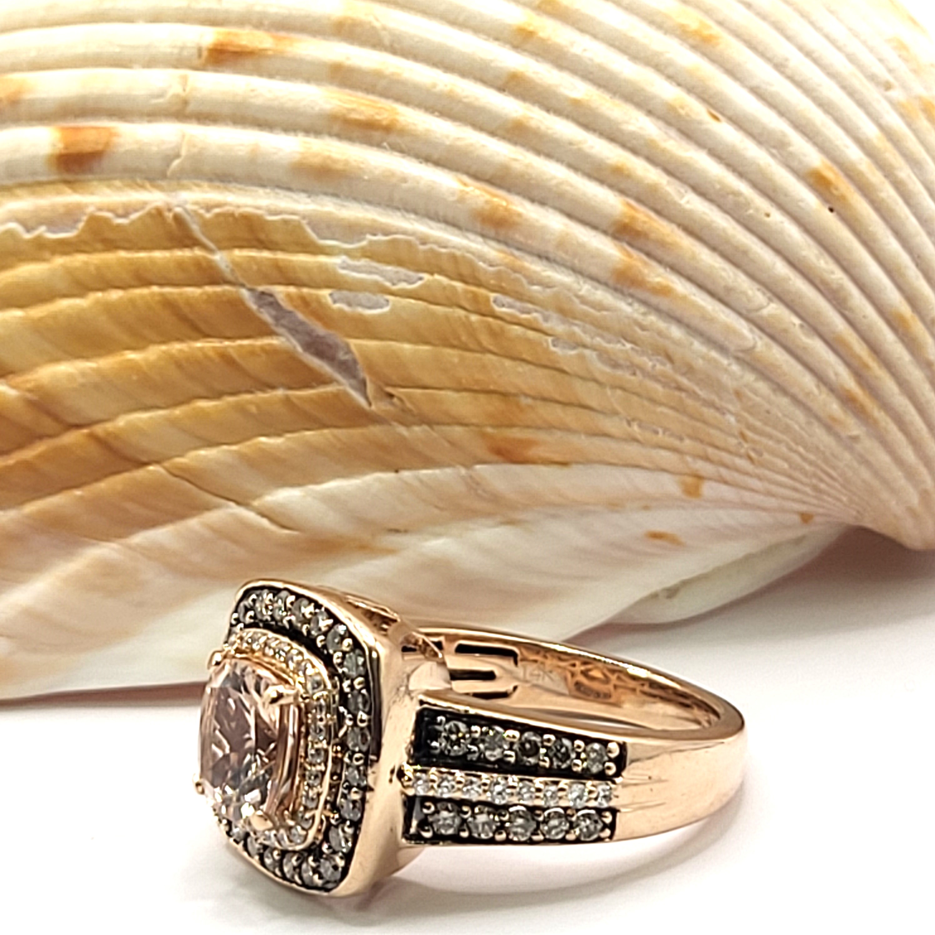 This 14 karat rose gold ring bears the LeVian hallmark and features an approximate 2.00 carat cushion-cut Morganite. The ring has a wide, cushion-shaped frame and wide, tiered shoulders, set with approximately 1.00 carats total weight of SI clarity chocolate and vanilla diamonds. There is a supportive under gallery and a raised, trussed, side gallery. This ring is a US size 7. See below for sizing details and other information. Admin:33110/16irt”.