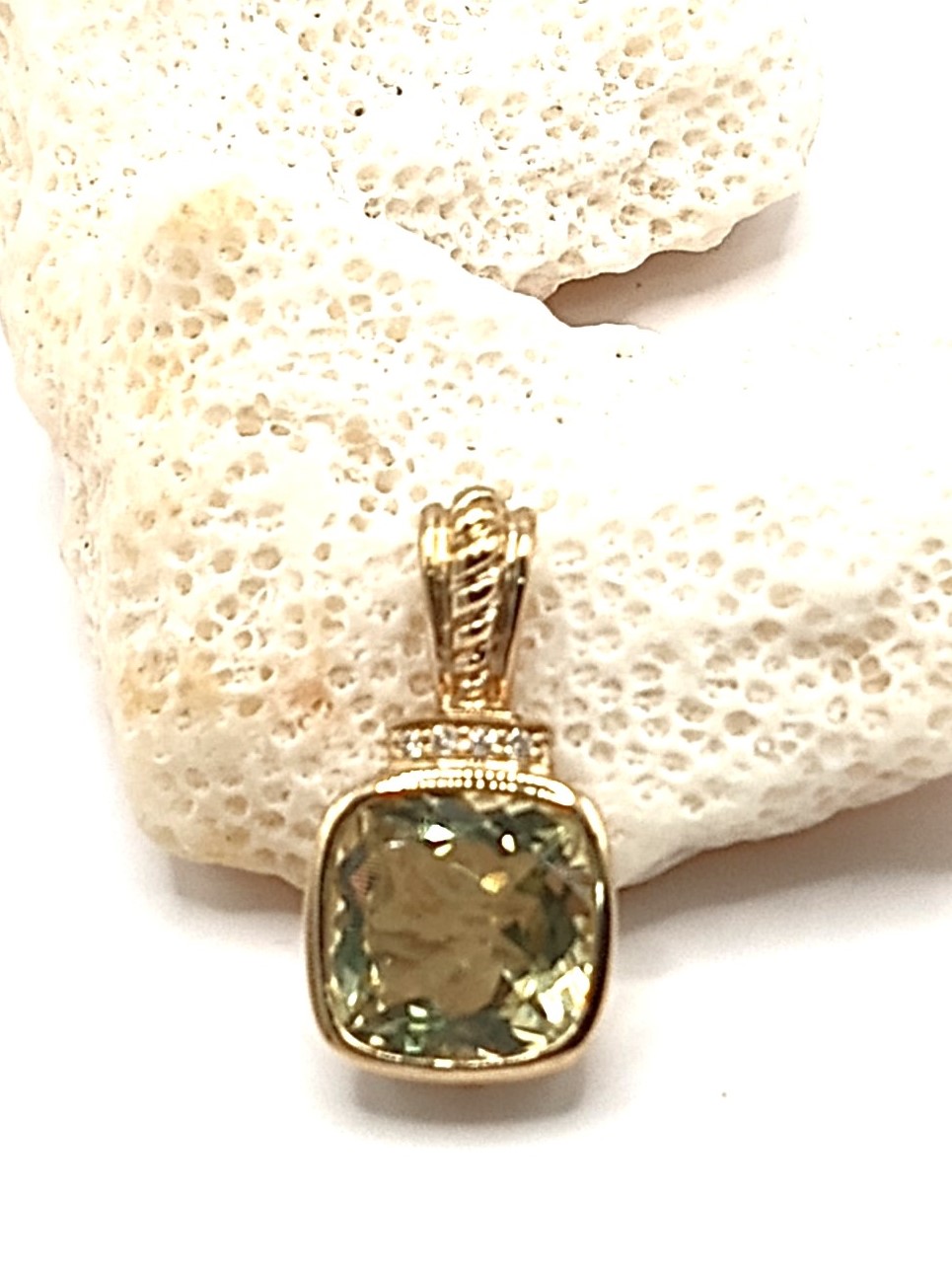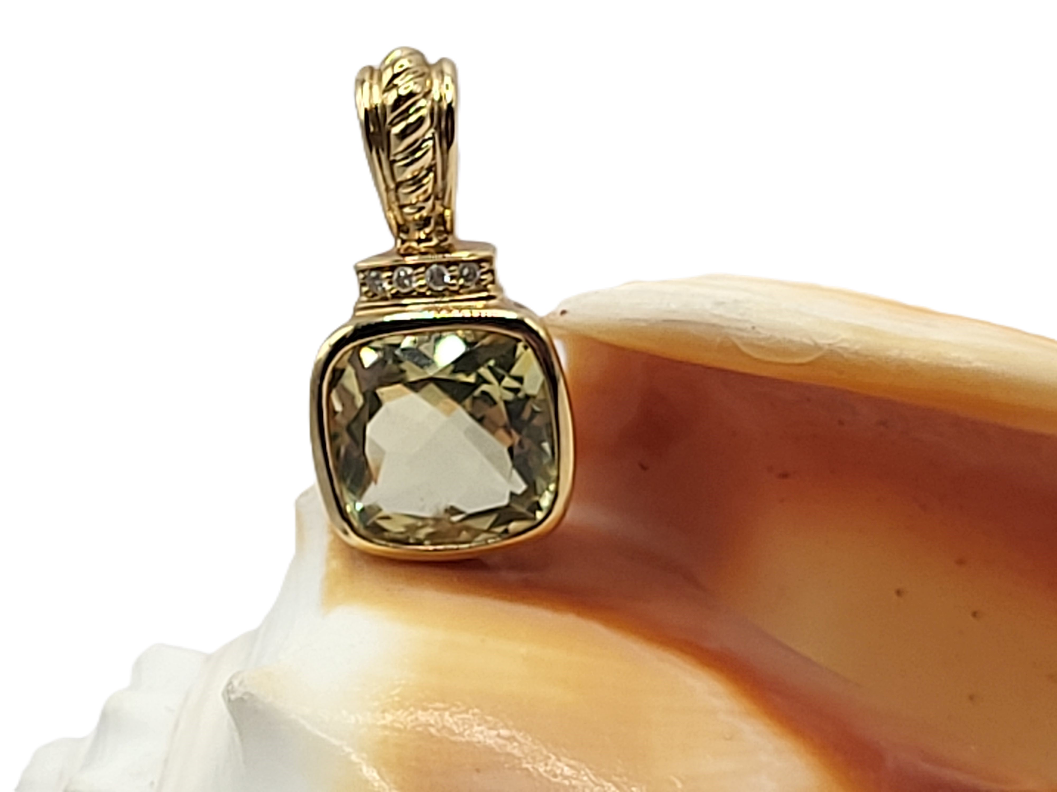 This is a 14 karat yellow gold pendant that features an illuminating 3.36 carat cushion-cut, bezel-set lemon quartz and .02 carats total weight of round, brilliant-cut, H color, SI2-I1 clarity diamonds for accent along the topl The pendant has a solid bail with a gold bead finish that can accommodate an approximate 2.5mm wide chain. 2.2 grams