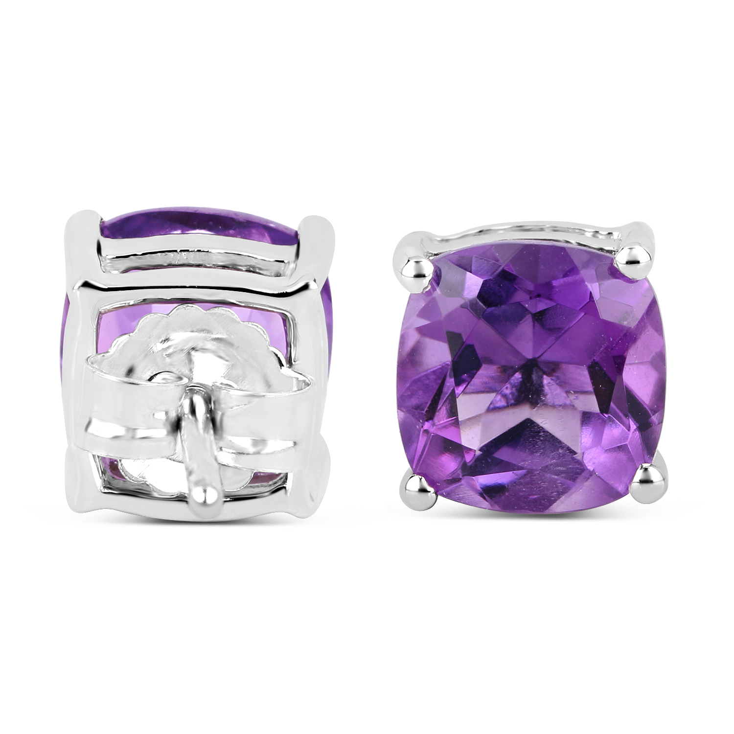 This pair of sterling silver earrings features 3.60 carats total weight of cushion-cut, genuine amethysts with a rich, violet-purple color. The amethysts are prong-set and the settings have a tarnish-resistant rhodium finish. The earrings attach to the earlobes with posts and friction backs. AdminCode: KQJ6463/lr