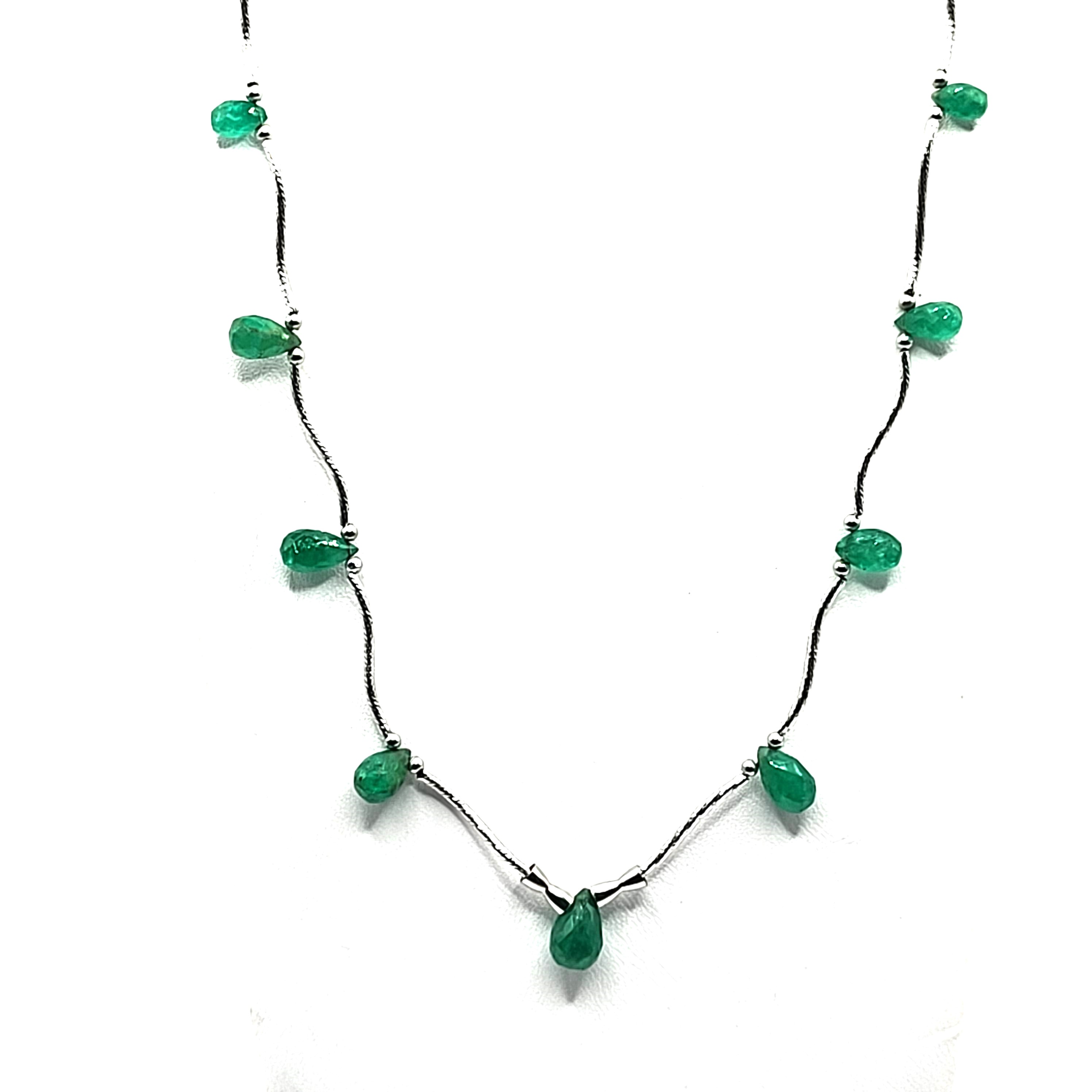 It is so light and delicate, it seems to float on your neck! This necklace is constructed with beautifully etched, 14 karat white gold, curved, hollow tubes that are strung onto a silver-colored cable (unknown metal, may be white gold). Each segment is separated by 14 karat white gold beads and briolette-cut, teardrop-shaped, genuine emeralds for an approximate total of 5.00 carats. The necklace is 18" with a "bean" shaped plunger clasp. This necklace is delicate and graceful and not intended for everyday wear. Admin: 33109/1bbg