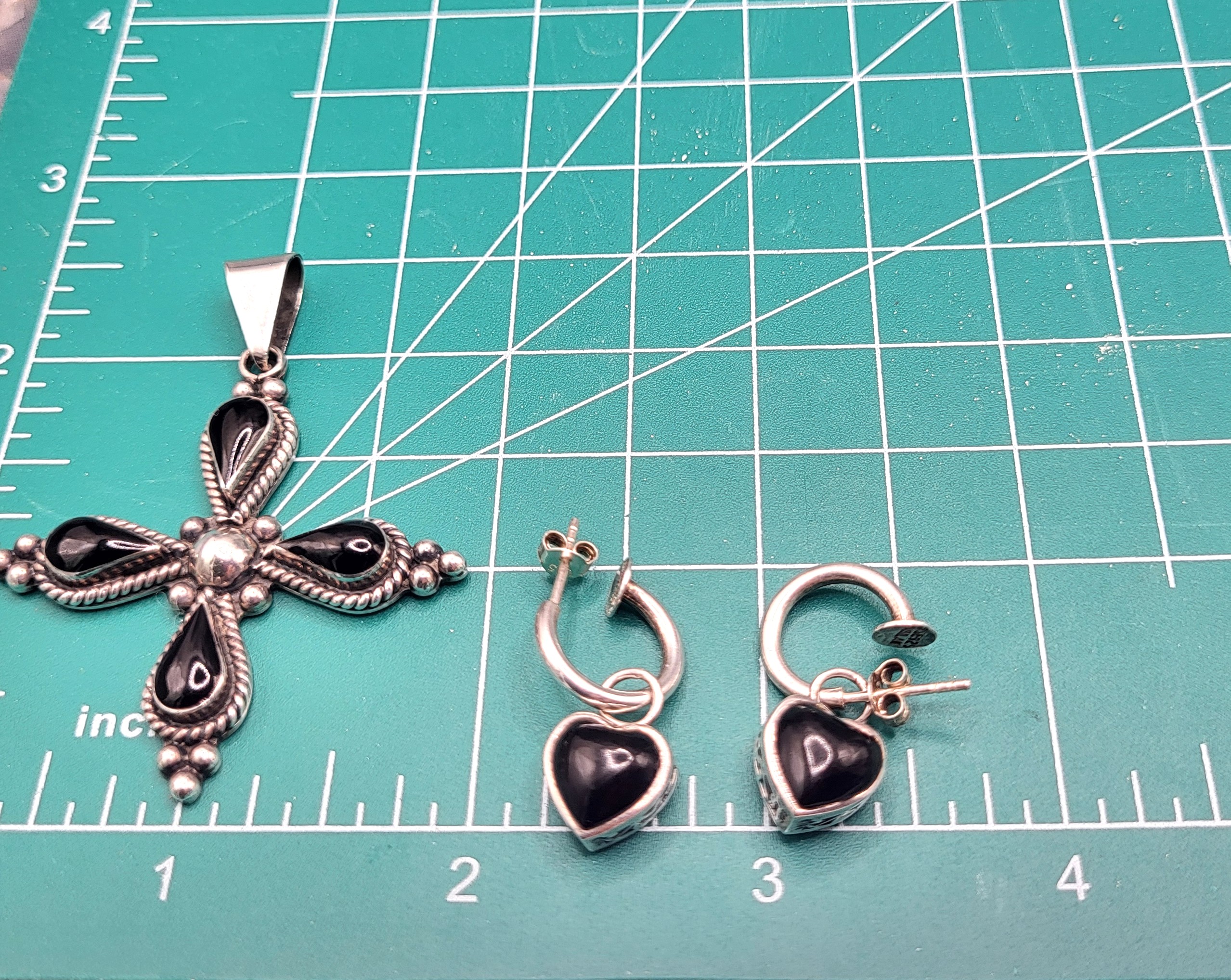 A sterling silver cross pendant features four polished, teardrop-shaped black onyx with sterling silver bead accents and a solid back gallery. A solid bail that is attached to a jump ring can accommodate up to an approximate 5.25mm chain. The bonus earrings are REVERSIBLE! They are sterling silver half hoops, marked SE Thaniland, with heart-shaped, polished black onyx in the front and beautiful scrollwork on the back with reticulated galleries in between. The earrings attach to the earlobes with posts and butterfly backs and have a flat stop plate to prevent the heart from sliding off. .Admin: K33/