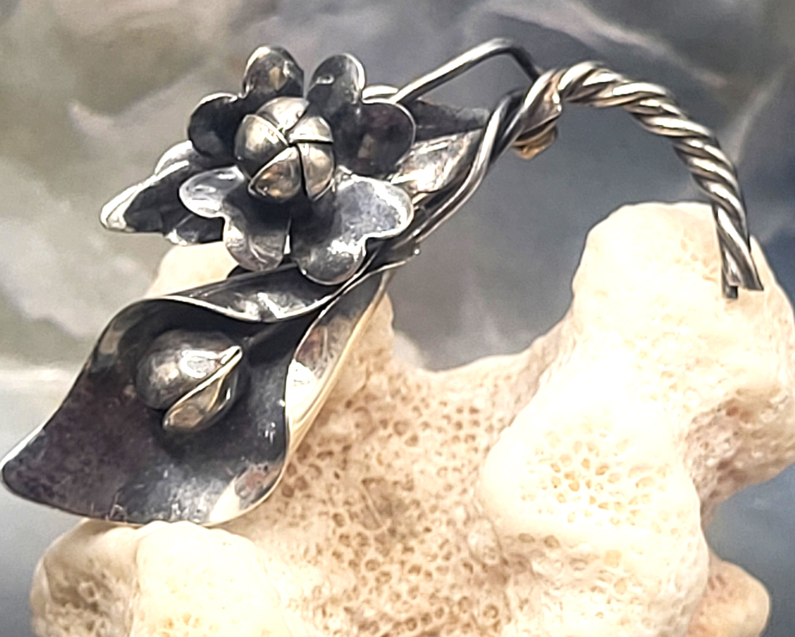 This vintage sterling silver brooch, pin is a work of art, as well as a piece of fine jewelry. The twisted stems end in a curve resembling the letter "J". Fine sheets of sterling silver are cut into heart-shaped flower petals, and are curved into the budding centers. Even the backs of the flowers are etched with incredible detail of tendrils and venations. The brooch is approximately 1" long and has a locking "C" clasp.