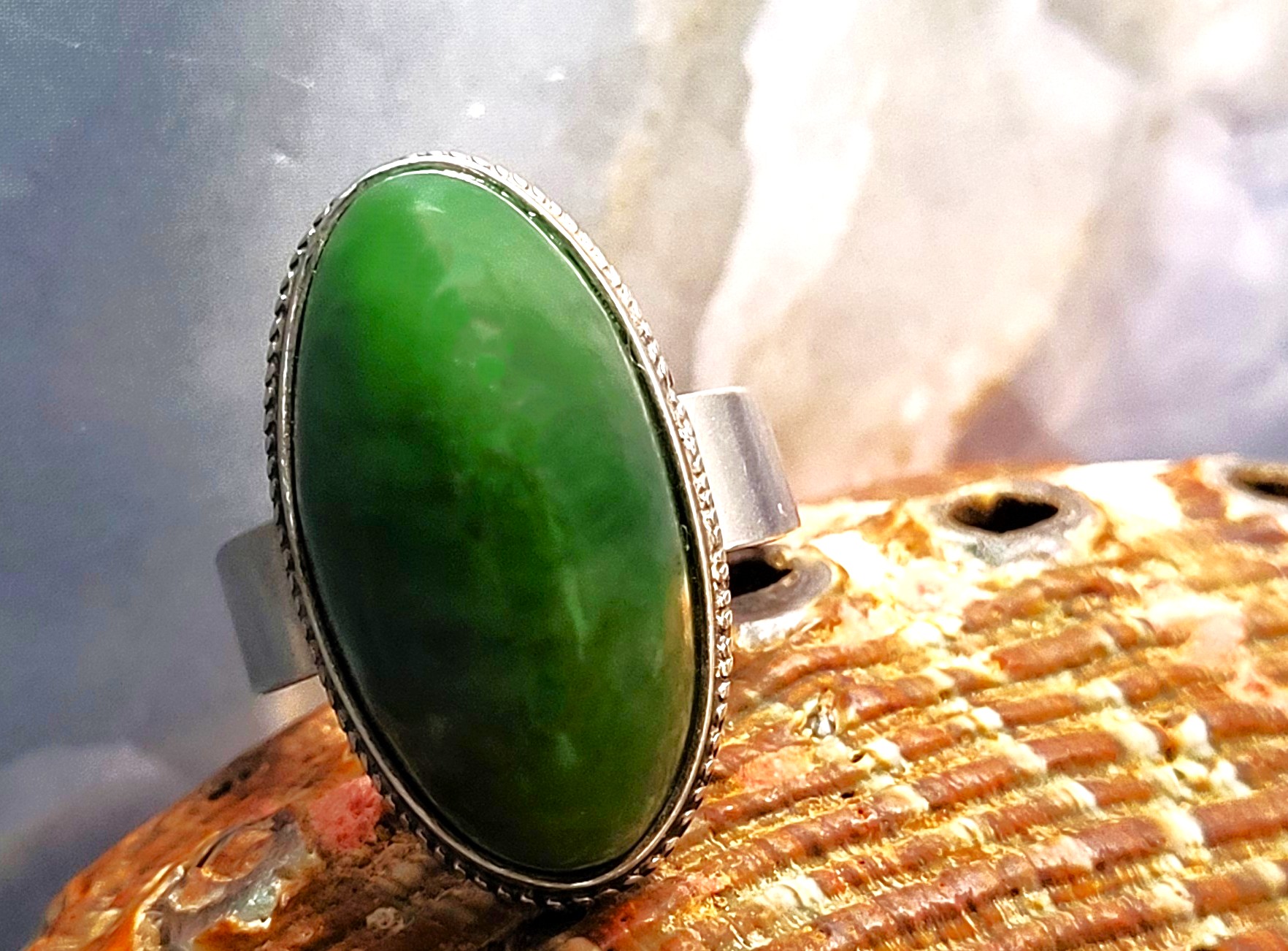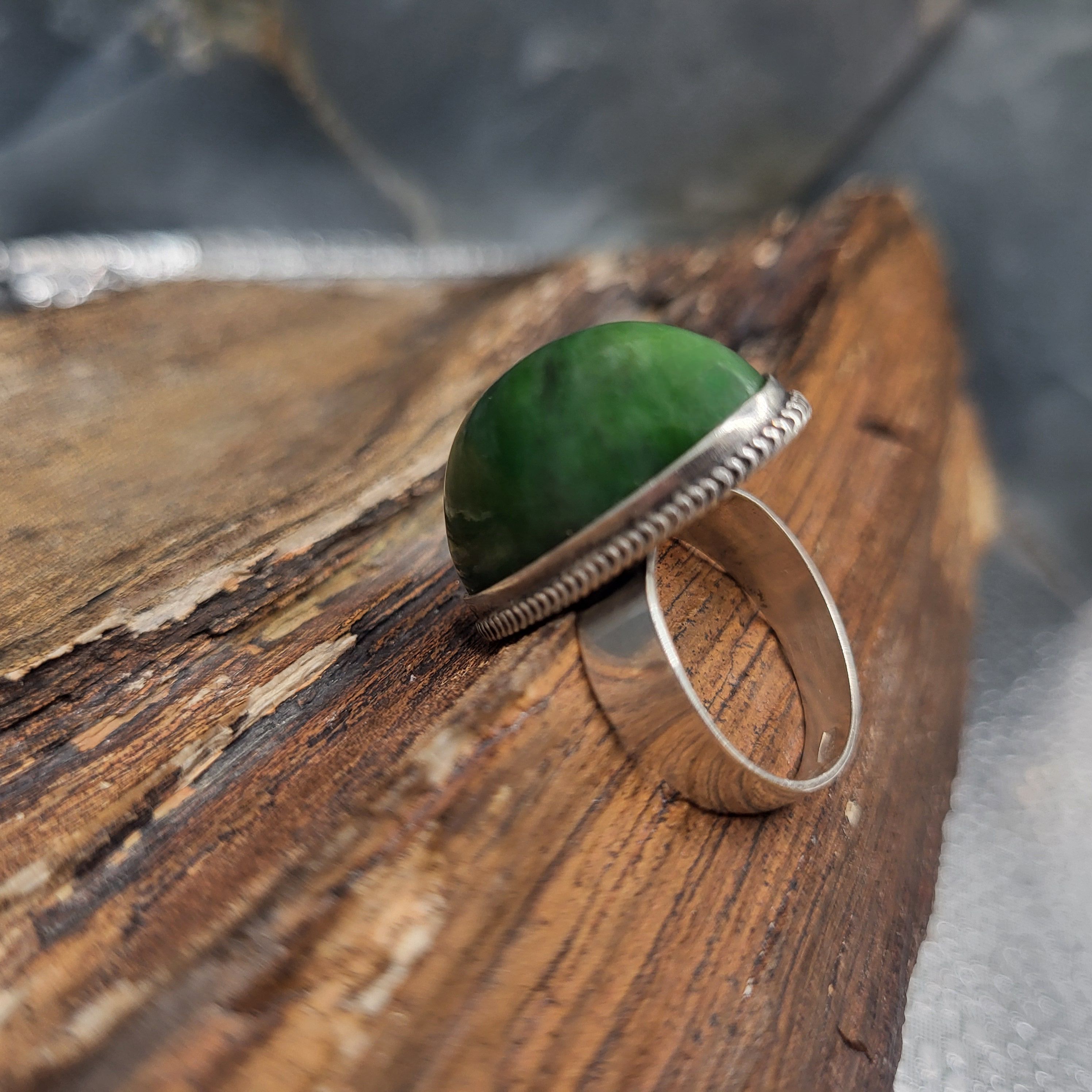 This sterling silver ring, believed to be circa 1970’s, is a statement ring featuring an approximate 24mm x 16mm x 10mm oval, genuine dark green nephrite jade oval cabochon. This is a simple bezel-style ring with a plain, wide shank.  The silver mark is on the inside of the 6mm shank and indicates the ring was made in the Soviet Union with….See sizing details and other information below. AdminCode: KJB9213/hhh