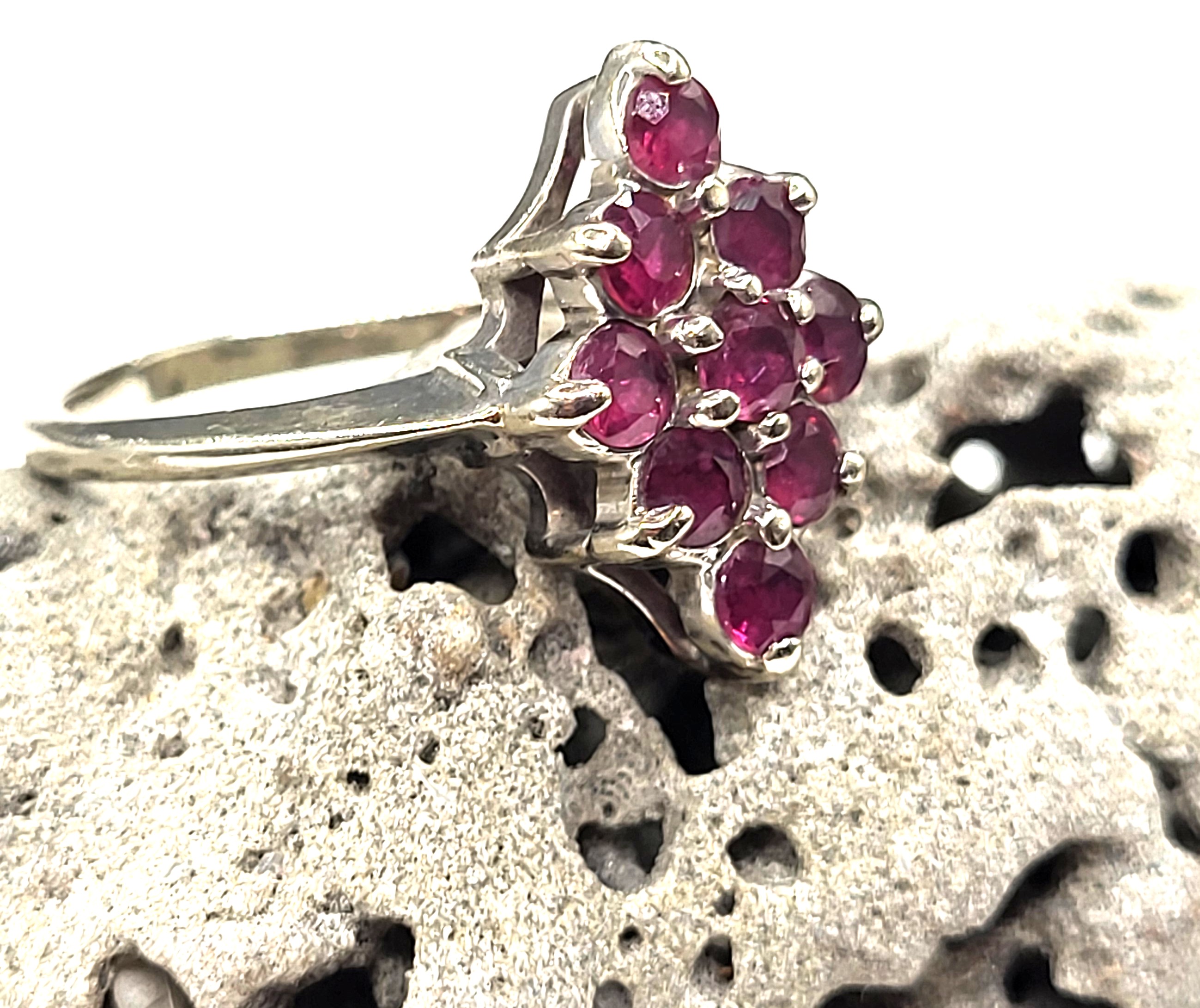 This 14 karat white gold ring with approximately 1.00 carat total weight of round, faceted genuine rubies that are prong-set in a navette-shaped cluster. The ring is US size 7 and can be sized. It is from the estate of a local woman who is downsizing and told the story of when she bought this ring for herself in the late 1970’s (she thinks that is the correct time frame) in Nashville, TN. She said she fell in love with it because it reminded her of the Diamond Card soldier in "Alice in Wonderland)! She stated that she outgrew the ring decades ago, and it sat in a jewelry box almost forgotten and now she hopes another young lady will soon have it and love it just as much.3.58g Admin: PKD7160/23