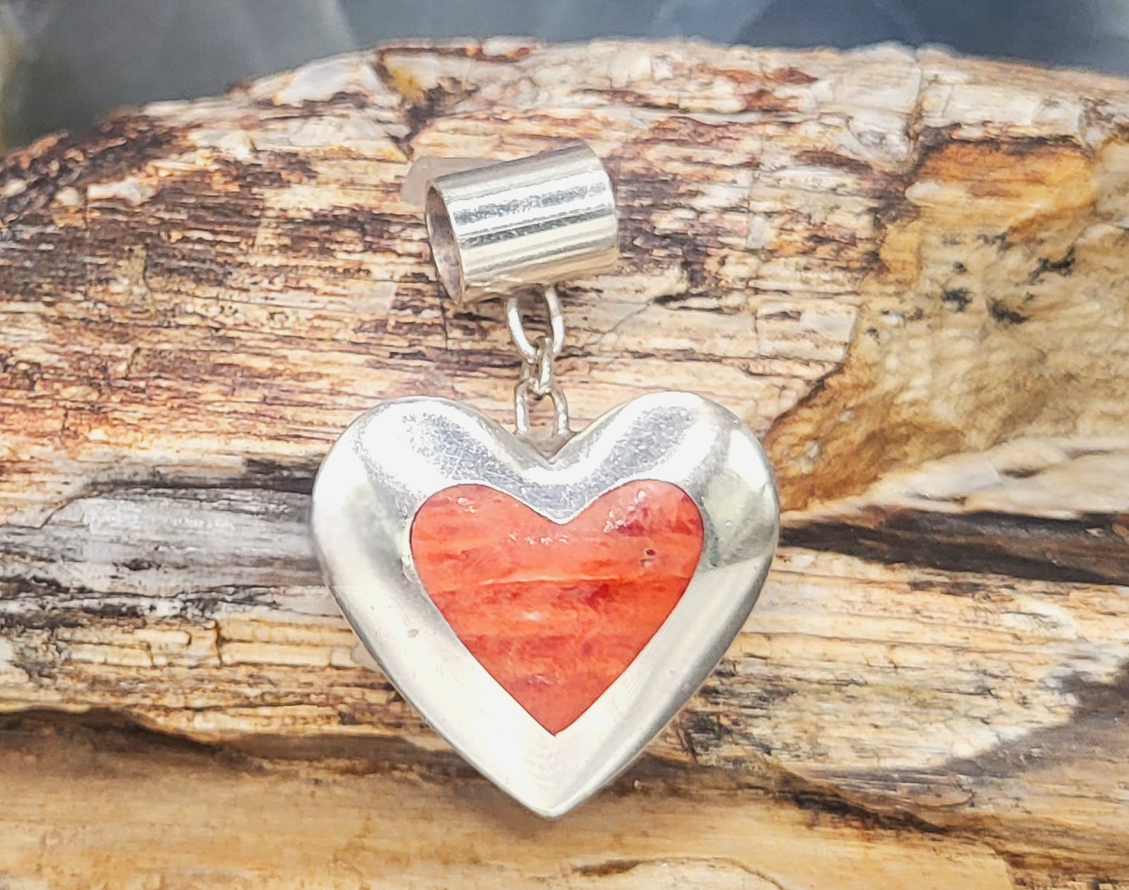 A beautiful piece of orange spiny oyster shell, measuring approximately 17mm is inlaid into a wide, heart-shaped frame made of high content, polished sterling silver. The pendant is approximately 28mm in diameter and with the dangling slide hangs 1.5". The pendant is stamped .950 and the bail opening is approximately 6.5mm and can accommodate up to a 6mm wide chain.THe individual sterling silver links connecting the bail to the pendant allow the heart to dangle freely with the movement of the wearer. This pendant is from an estate and is believed to have been purchased in the early 1980’s. AdminCode 33120/24-rrr