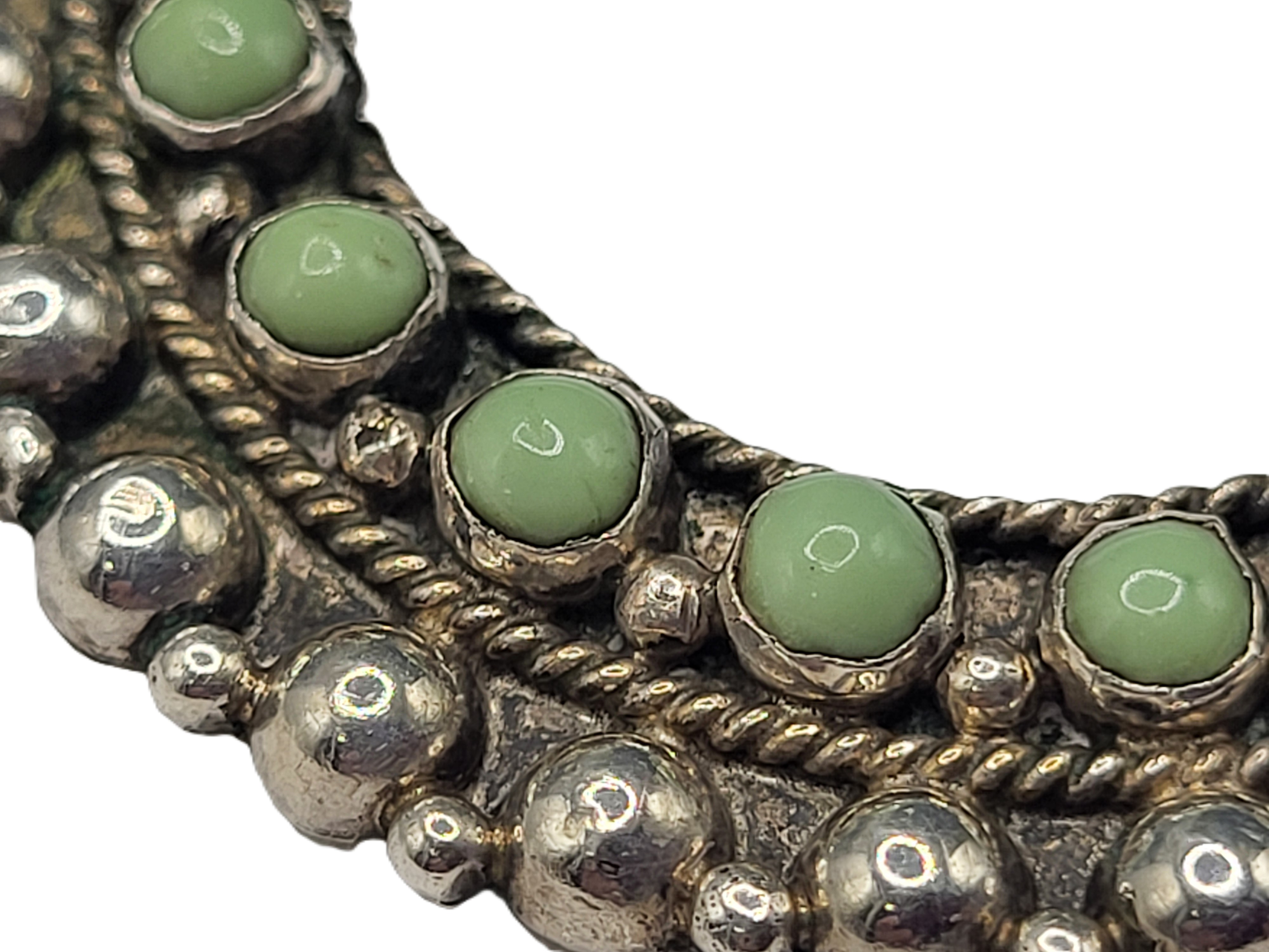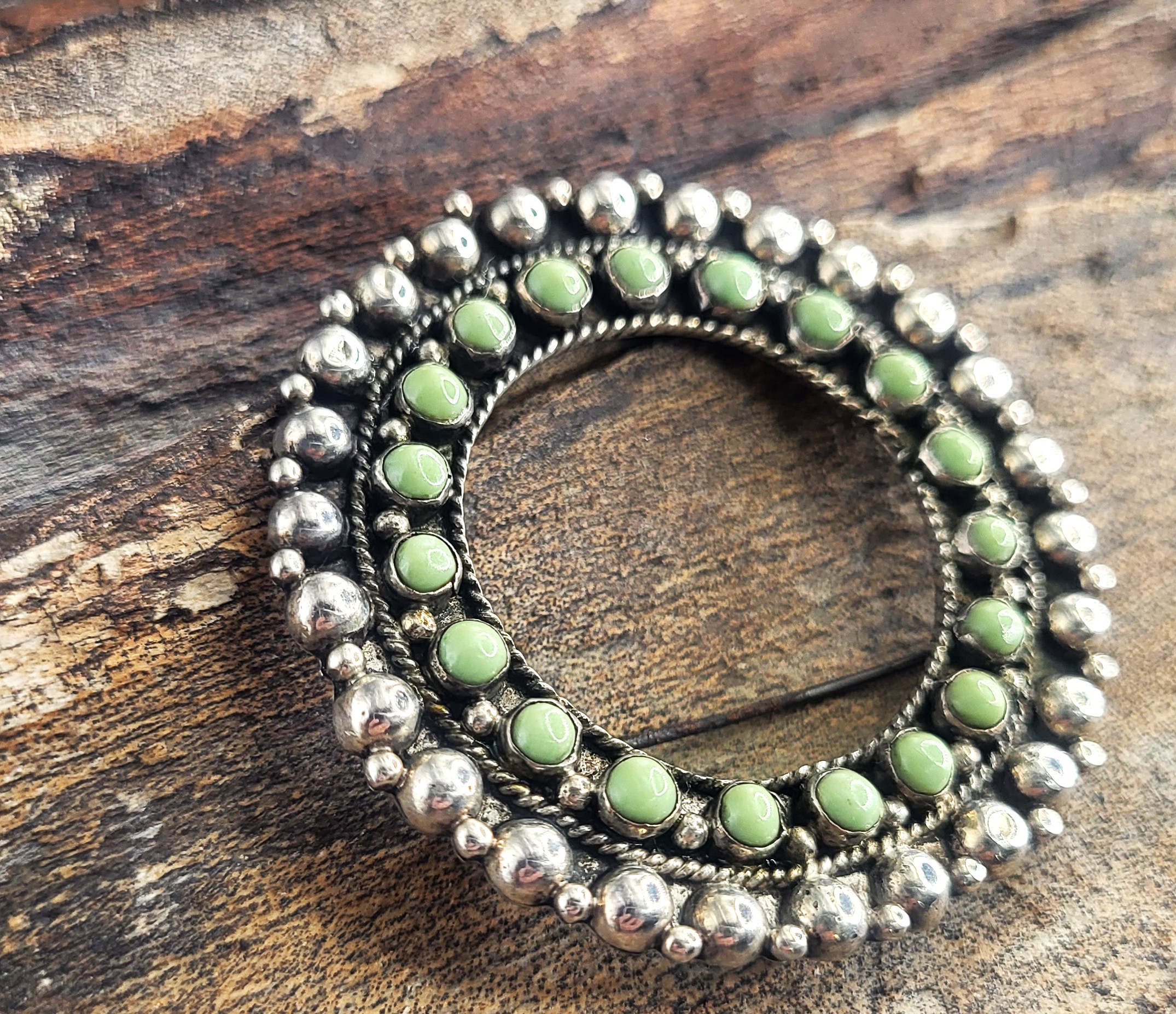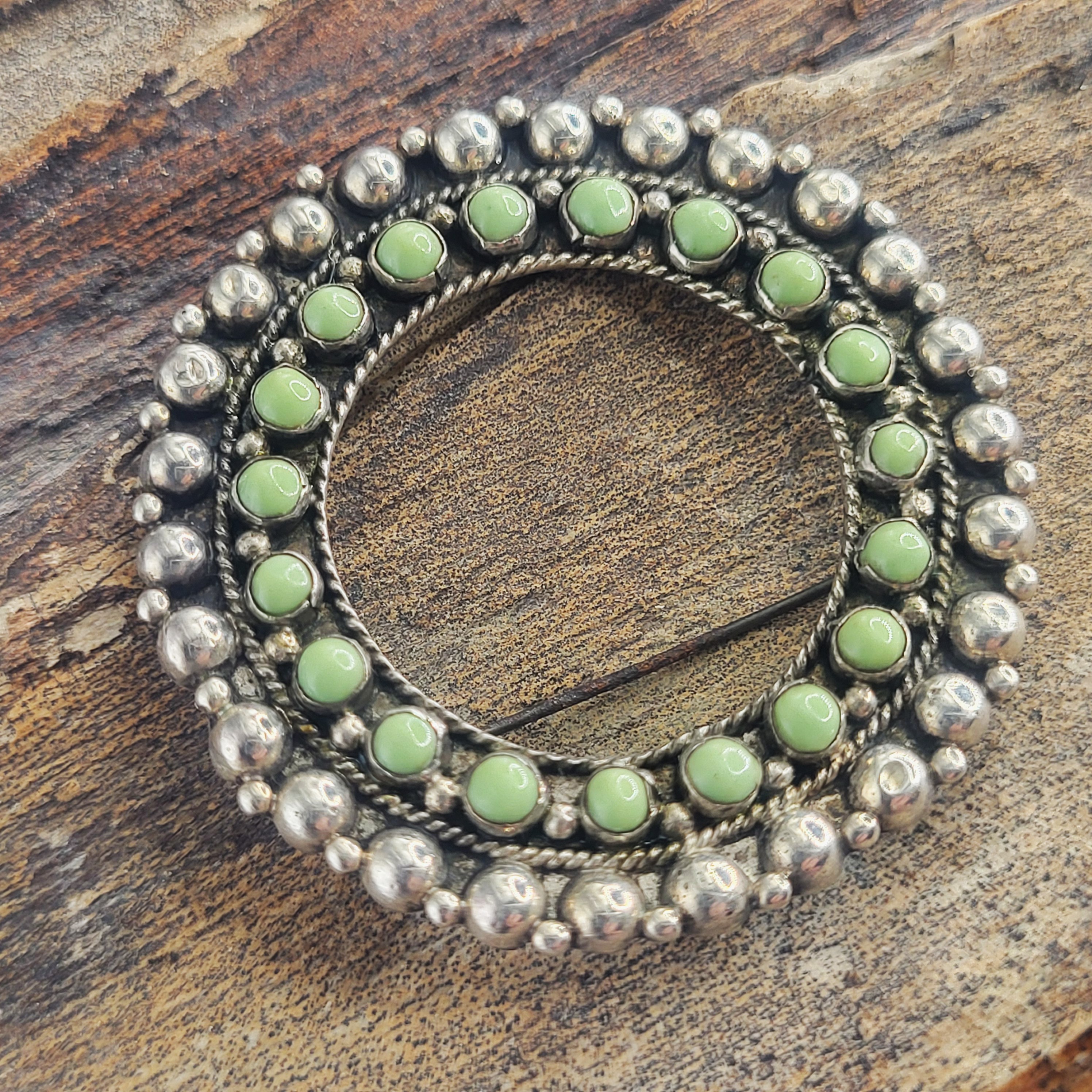 Hand-wrought in Mexico, this vintage sterling silver brooch features 19 round, polished green turquoise cabochons in a wreath-like circle. Circa 1950’s. The closure is a hinged pin on a locking "C" clasp, which is typical of jewelry from this era. The back is stamped Sterling MEXICO. Belonged to the grandmother of the lady whose estate this was. Believed to be Damele Turquoise, but could be Carico Lake.