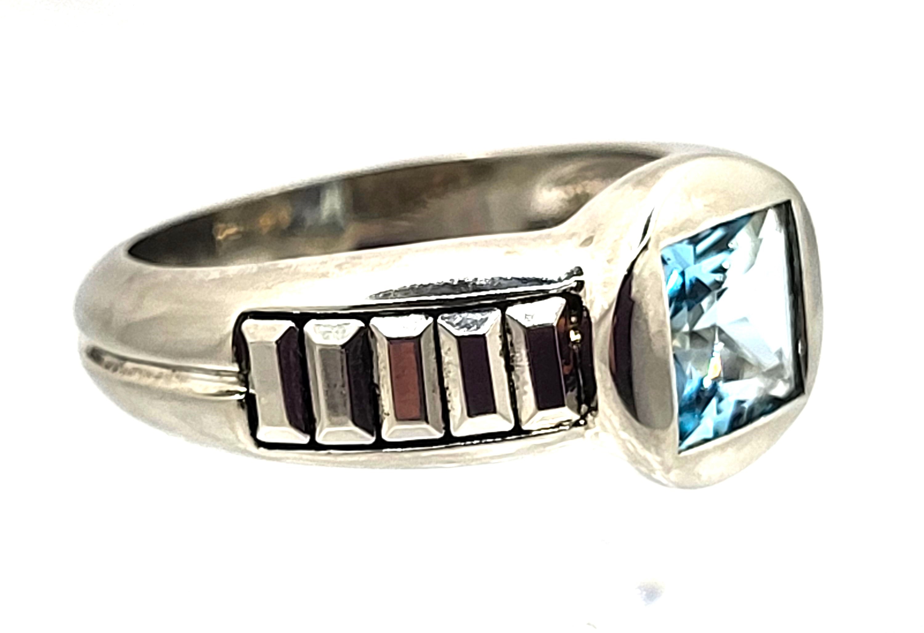 This ring has great designer appeal! This sterling silver ring features an approximate 1.50 carat, square-cut, bezel-set, genuine Swiss blue topaz that is nestled between shoulders that resemble "bars of silver". The bezel setting for the blue topaz is striking, with the solid build and contrasting rounded form. The top of the ring is approximately 11mm and tapers to approximately 4mm. This ring is US size 9 and can be sized for an additional charge. Please contact Bidfair Fine Jewelry for sizing details. This ring can be worn comfortably by either gender. Weight: 7.59 grams Admin: 410633/hh