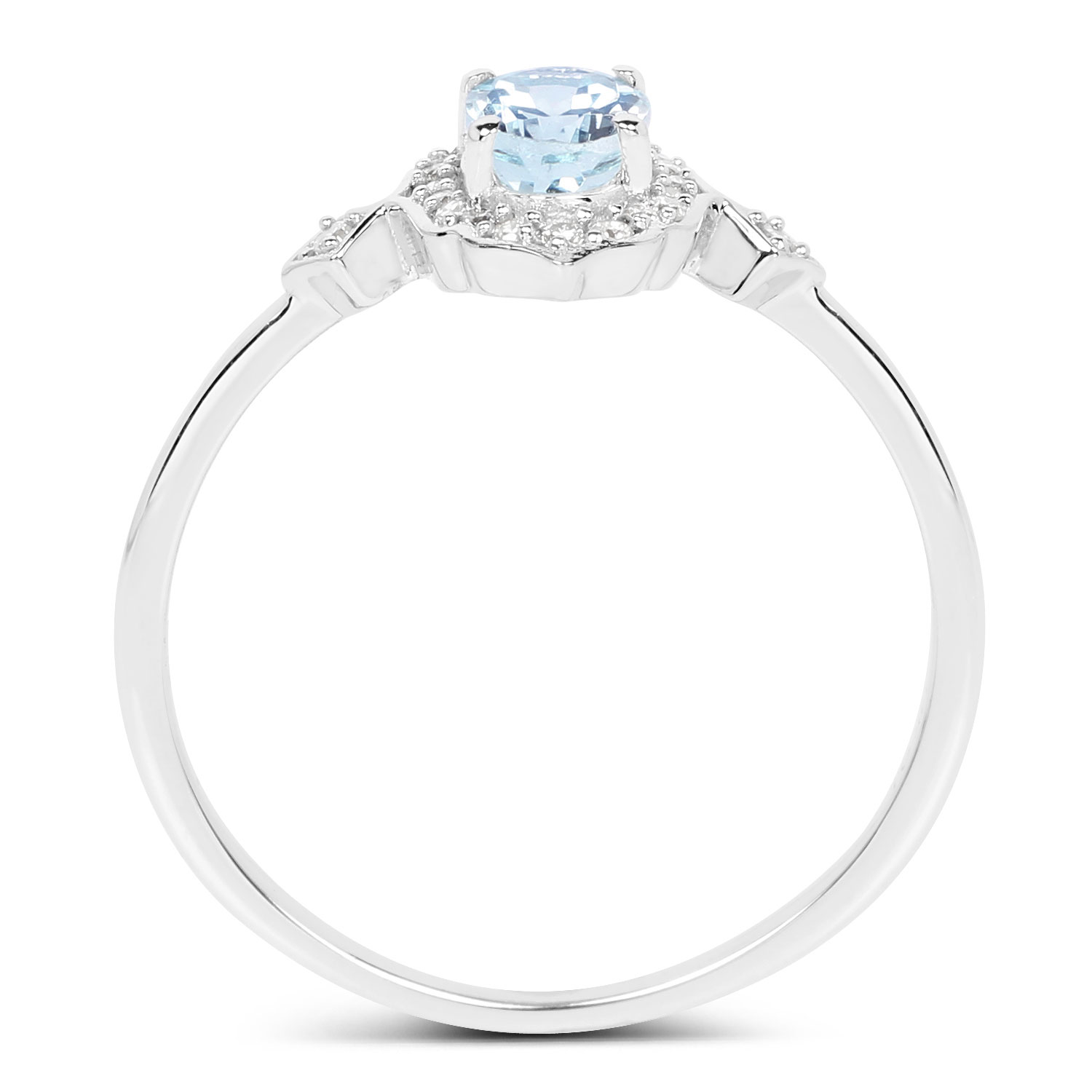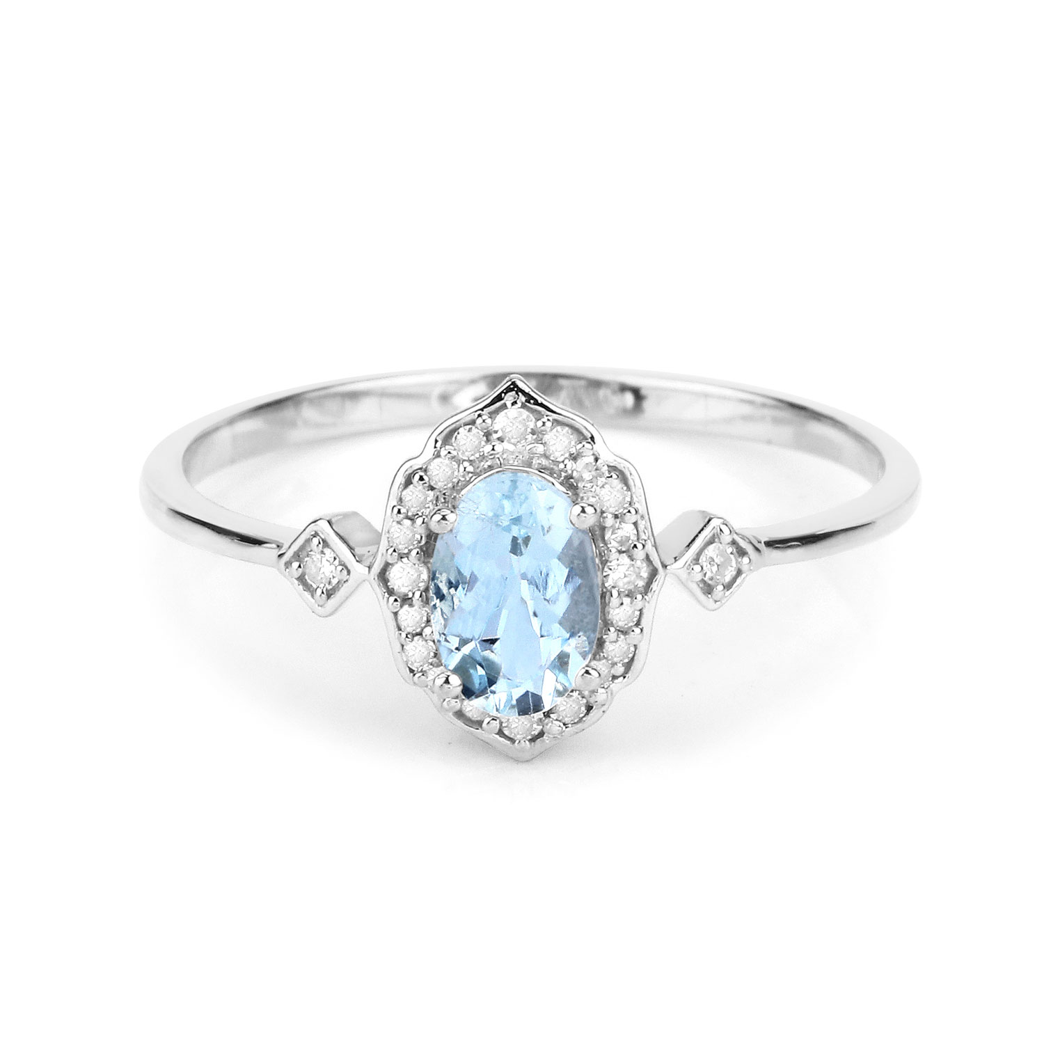 This 14 karat white gold ring features a .40 carat oval-cut, genuine aquamarine in a halo of .08 carats total weigh round, brilliant-cut, H-I color, I1 clarity diamonds. The ring is US size 6. Sizing options and other information are below. AdminCode: NQnis/ibe5
