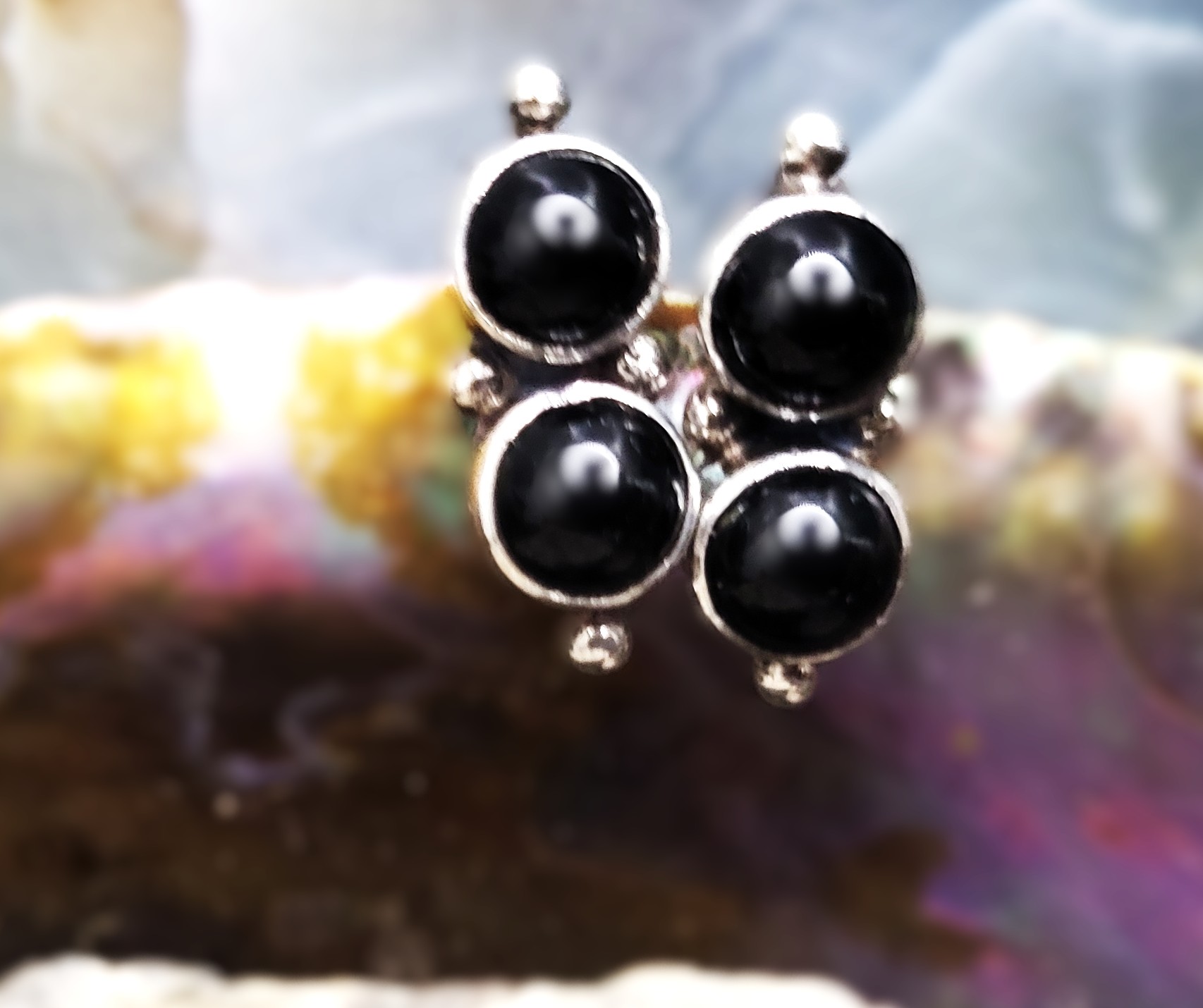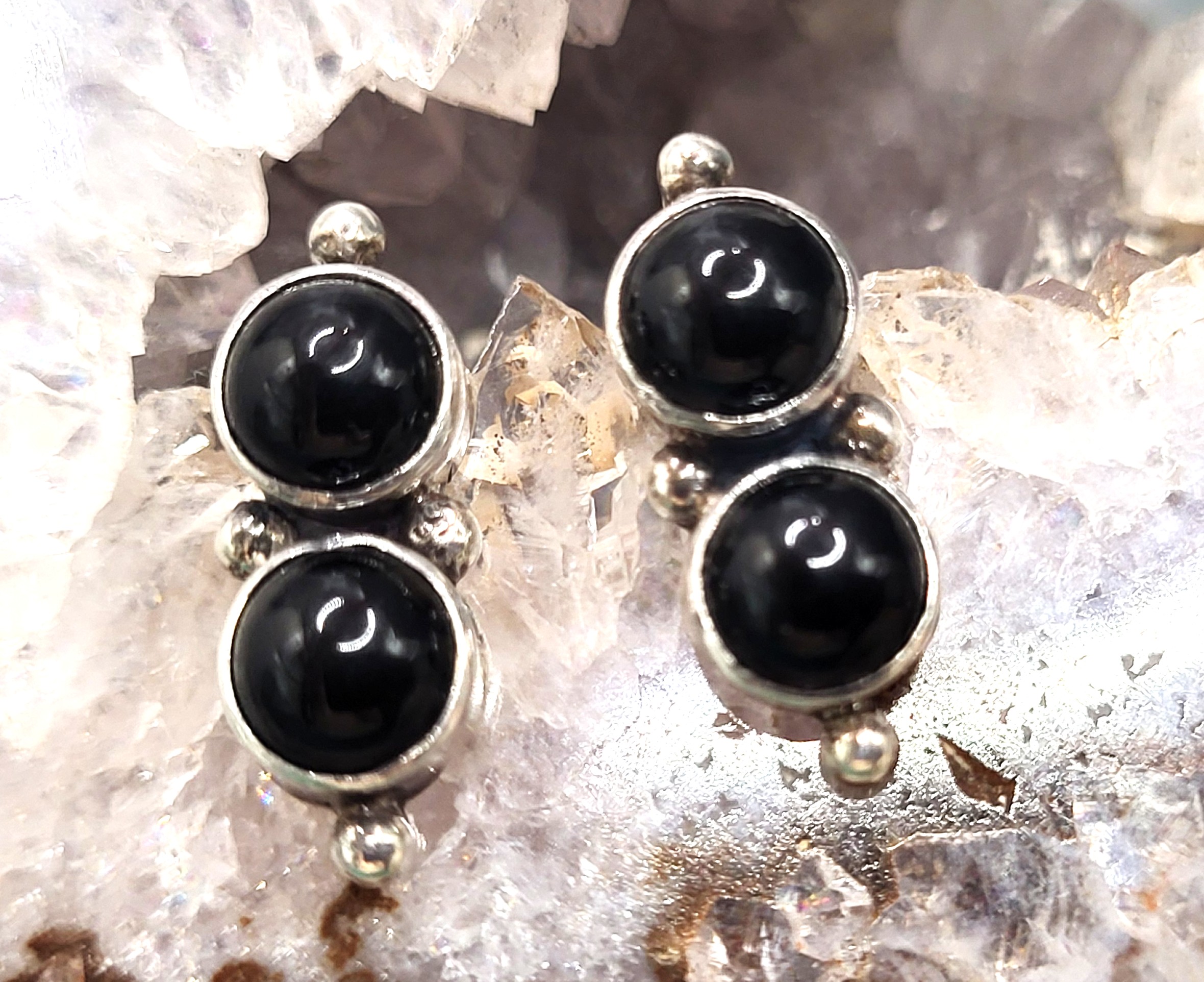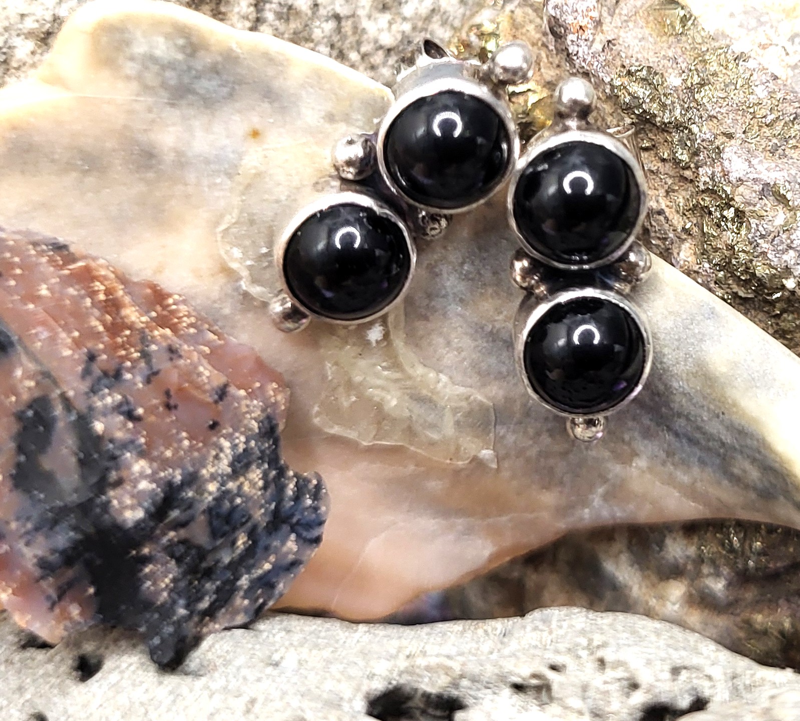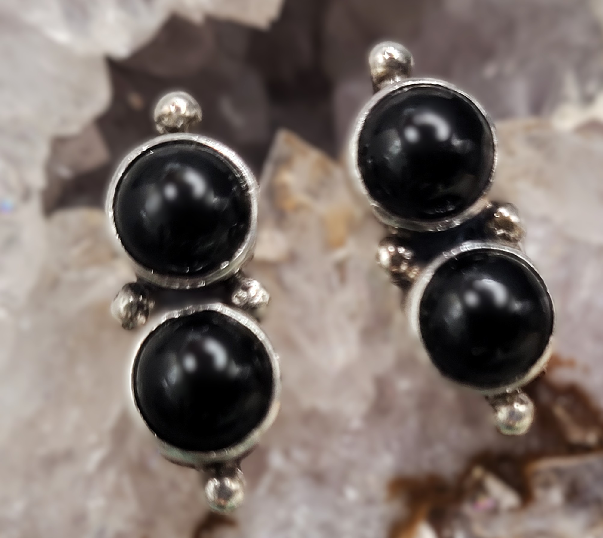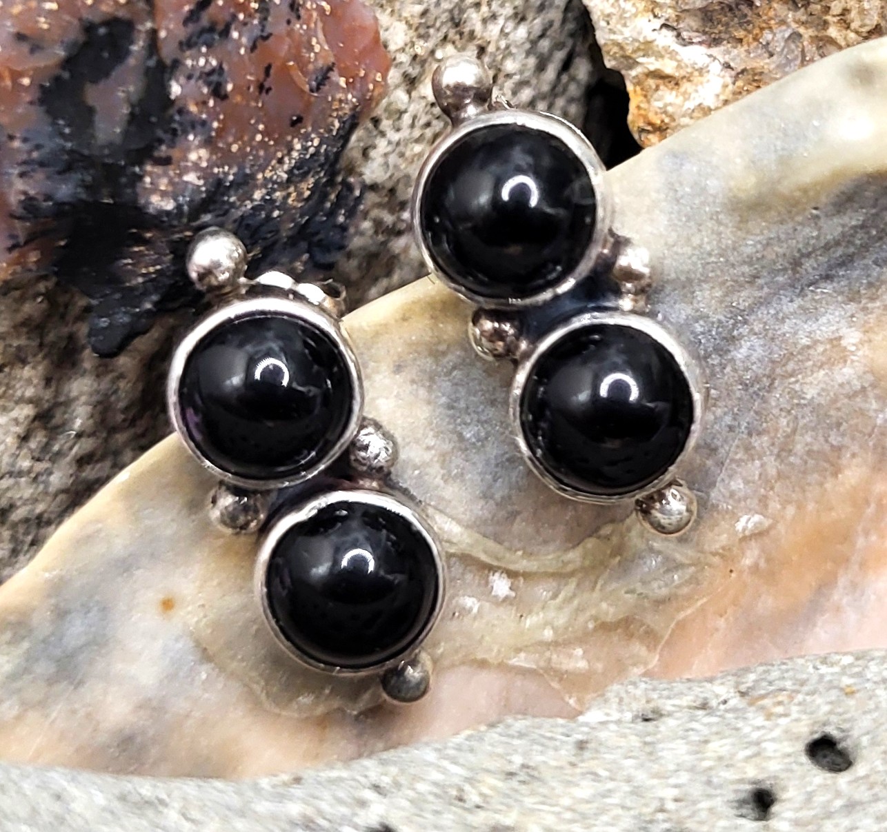 This is a pair of sterling silver earrings that are stamped NAKAI for Navajo artisans and silversmiths Grace and Gilo Nakai of Albuquerque, New Mexico. They have been making jewelry since at least the 1980’s and continue still.  These vintage earrings are simply graceful and lovely with two round cabochons of black onyx on each earring.   The black onyx are bezel-set and the top are 6mm black onyx, positioned above 5.5mm black onyx.  The earrings are 3/4" long and attach to the earlobes with posts and friction backs.