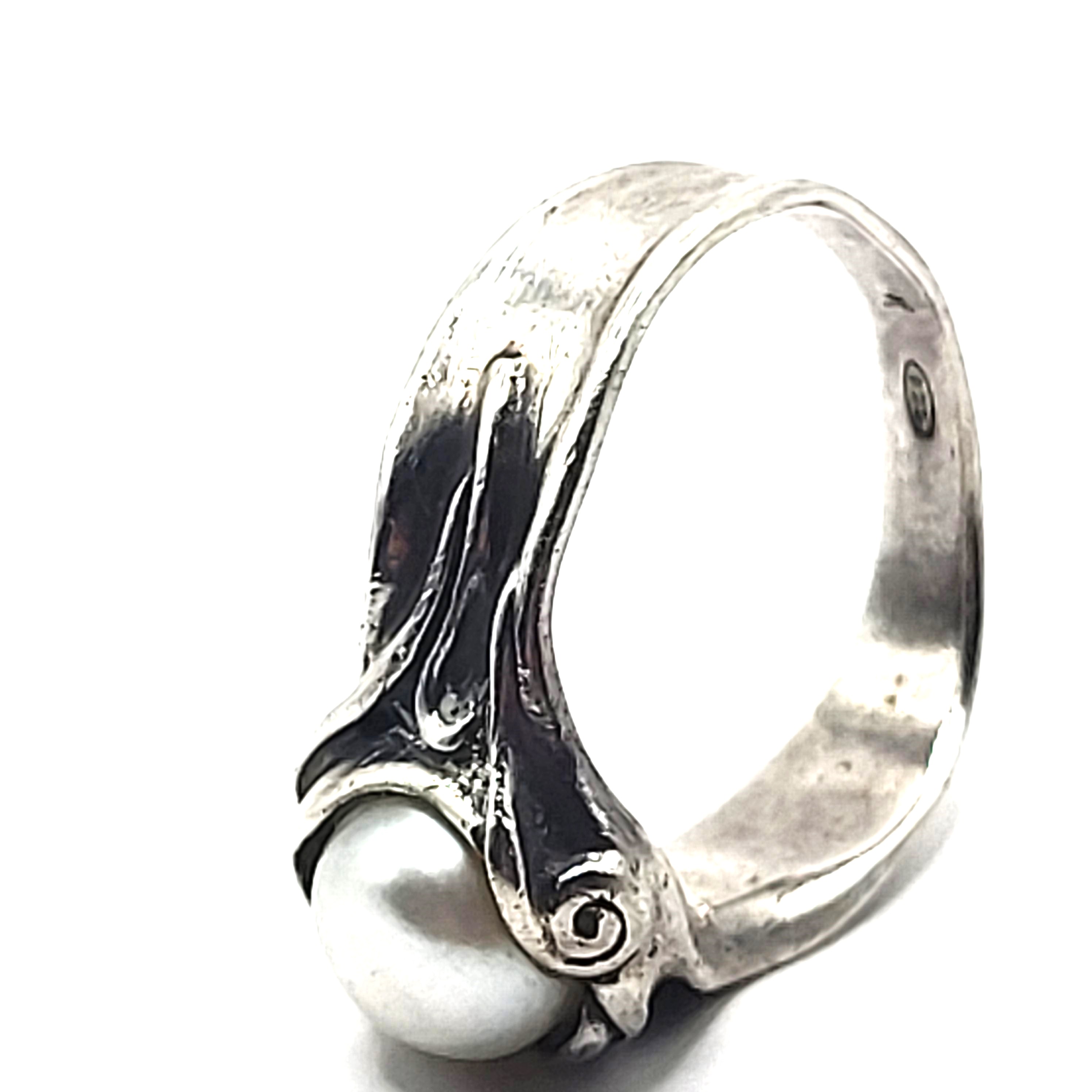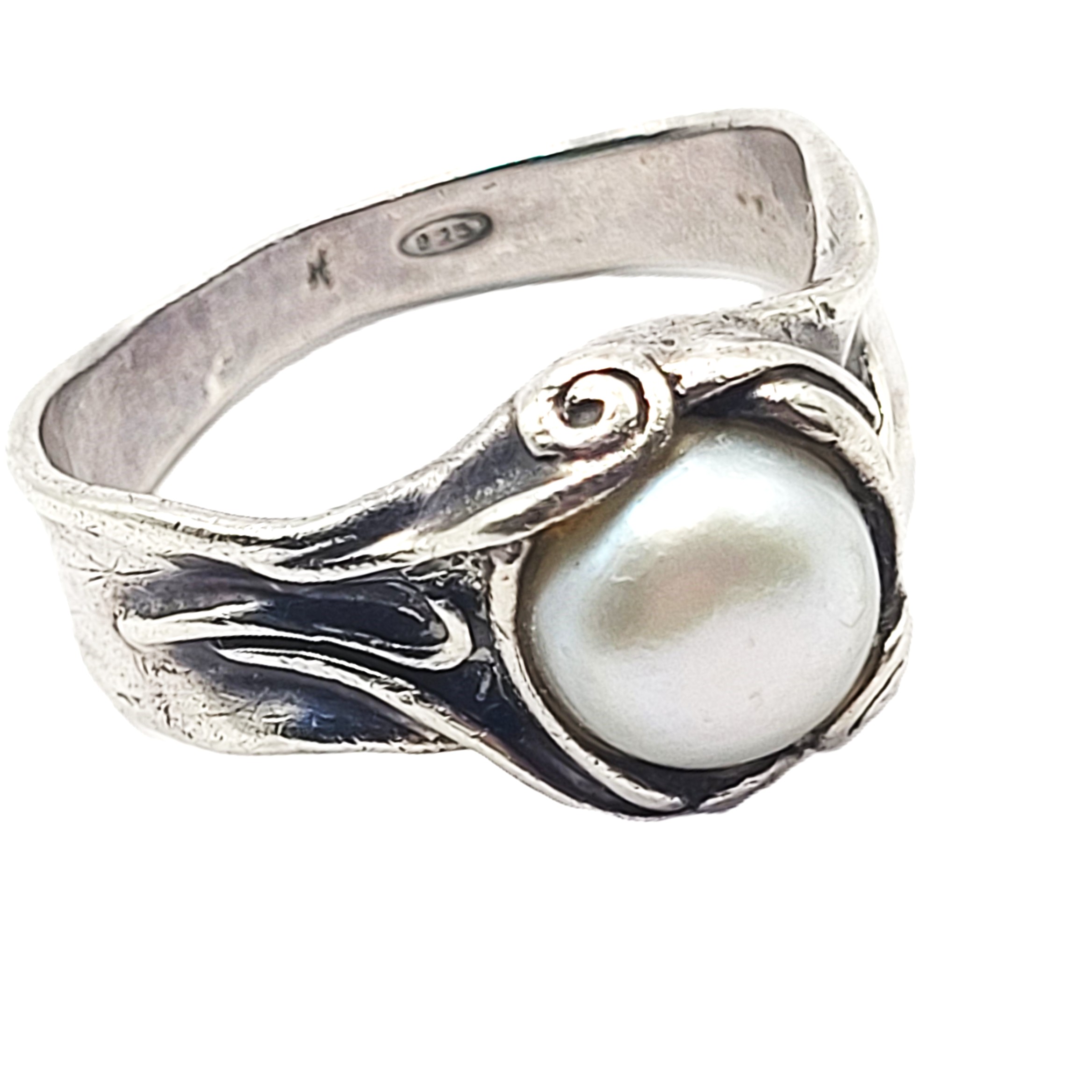 Hagit Gorali is an Israeli jewelry designer known for her sculptural and organic designs in sterling silver and gold. She draws inspiration from nature. "She has gained a devoted following, because of the high quality design and craftsmanship of her silver designer jewelry, which is handmade in Israel." This type of brutalist ring is just as trendy today, as it was in the mid-1900’s. even though this ring is from the early 2000’s! It features an approximate 7.75mm mabe’* pearl cradled in a nest of sterling silver vines and tendrils that snake down the slightly concave shoulders, that gradually taper into an asymmetrical shank, narrowing to approximately 3.5mm. This ring can be size by a professional jeweler.**. 6.4 grams Admin: 33122/10a
