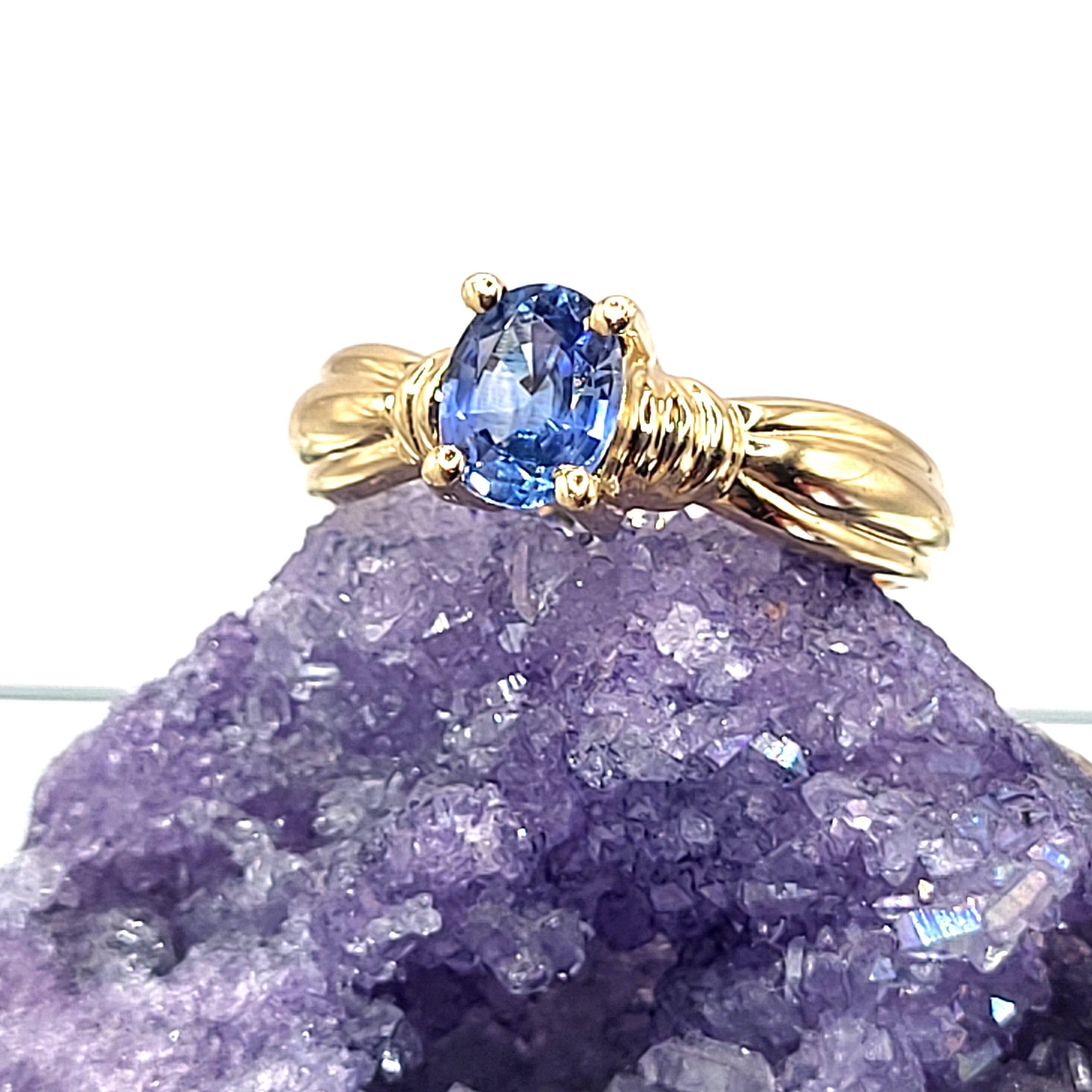 This 14 karat yellow gold ring features an approximate .59 carat oval-cut, eye-clean, light blue sapphire that is prong-set above ribbed, pinched shoulders that widen, then taper to an approximate 2mm shank. The ring bears the CID hallmark of Clyde Duneier Inc., who has been an "internationally recognized leader in the jewelry industry since 1910*. This ring is US size 8. See below for sizing options and other important information. Admin:33109/21bal *ClydeDunier Website
