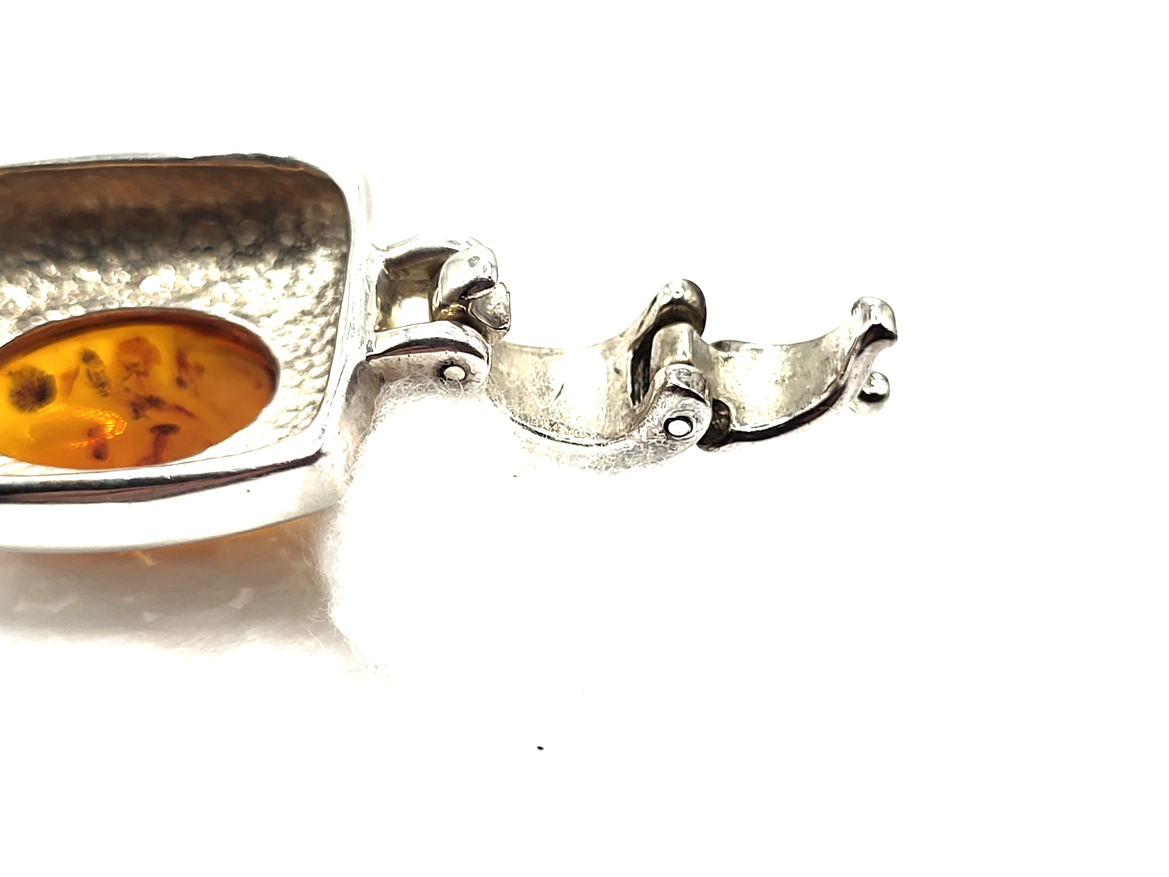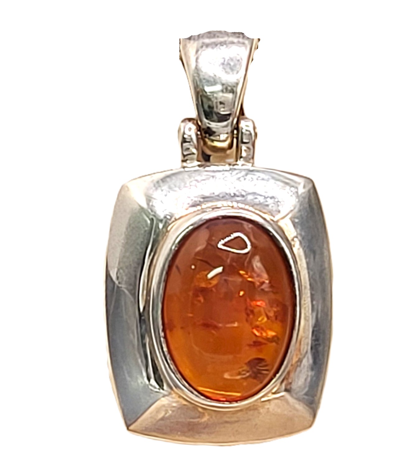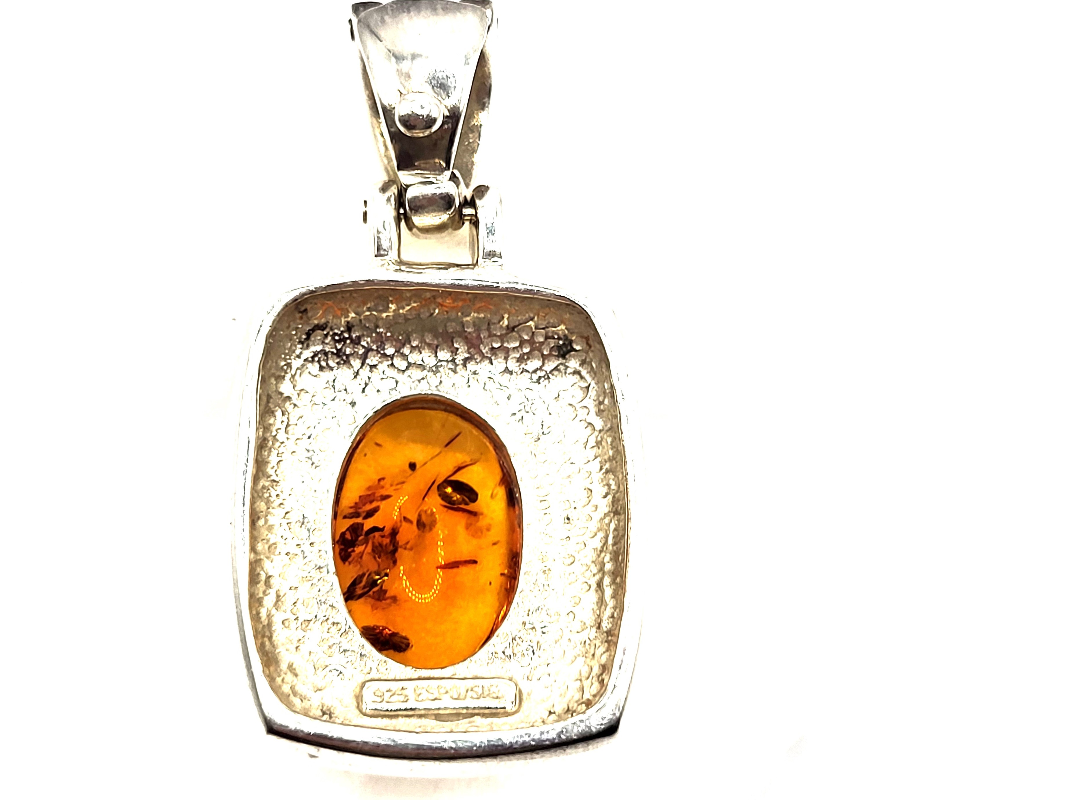 This sterling silver pendant features an approximate 18mm x 12mm, oval, cabochon, polished, bezel-set Amber with a wide, cushion-shaped, polished, sterling silver frame. The hinged bail can accommodate an approximate 6.5mm thick chain, and it opens to accommodate a pearl or bead strand style necklace. The pendant measures approximately 1.25" long x 1" wide. *Authenticity tests on the amber are listed below. Admin: K26237/hh