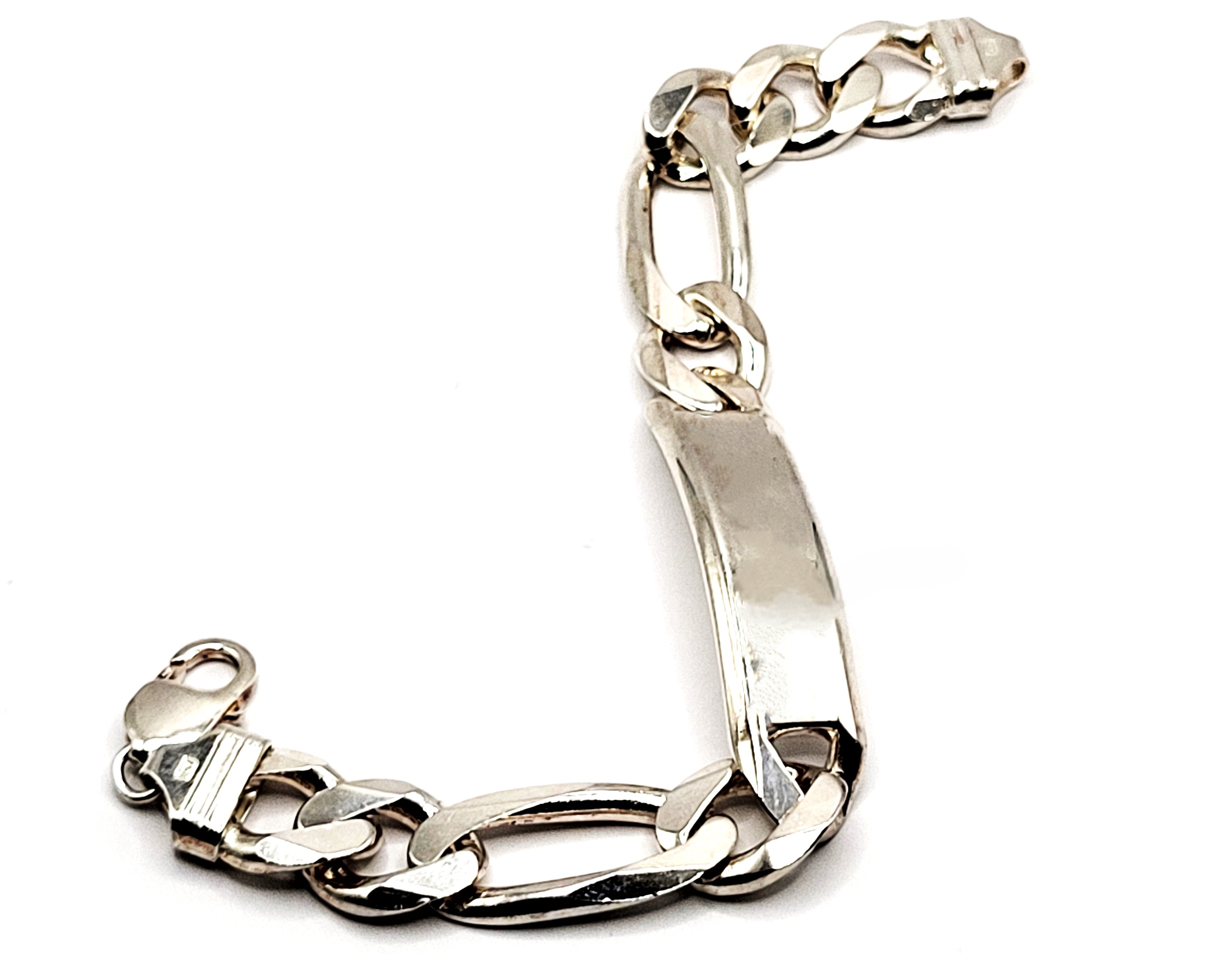 This is a very heavy sterling silver ID bracelet that is 8.25" long and has a lobster clasp. The convex, engravable plate is approximately 2" long, 5/8" wide, and 4.25mm thick. The figaro links are approximately 17mm wide. Admin: 33120/3ae