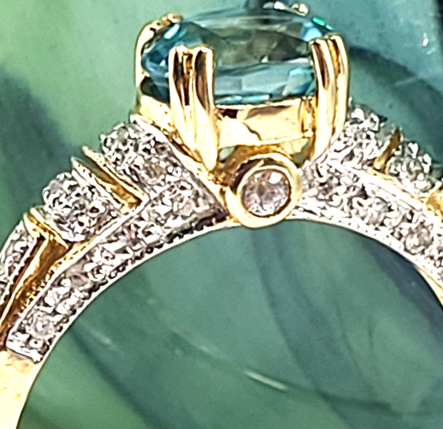 This is a 14 karat yellow gold ring that features a gorgeous oval-cut, East-West set with double prongs, genuine blue zircon, approximately 2.00 carats. There are .25 carats total weight of round, brilliant-cut diamonds in the bridge and along the shoulders. This ring is an approximate US size 10 and can be sized for an additional charge. Please contact Bidfair Fine Jewelry for sizing details. Admin: 33110/10lh