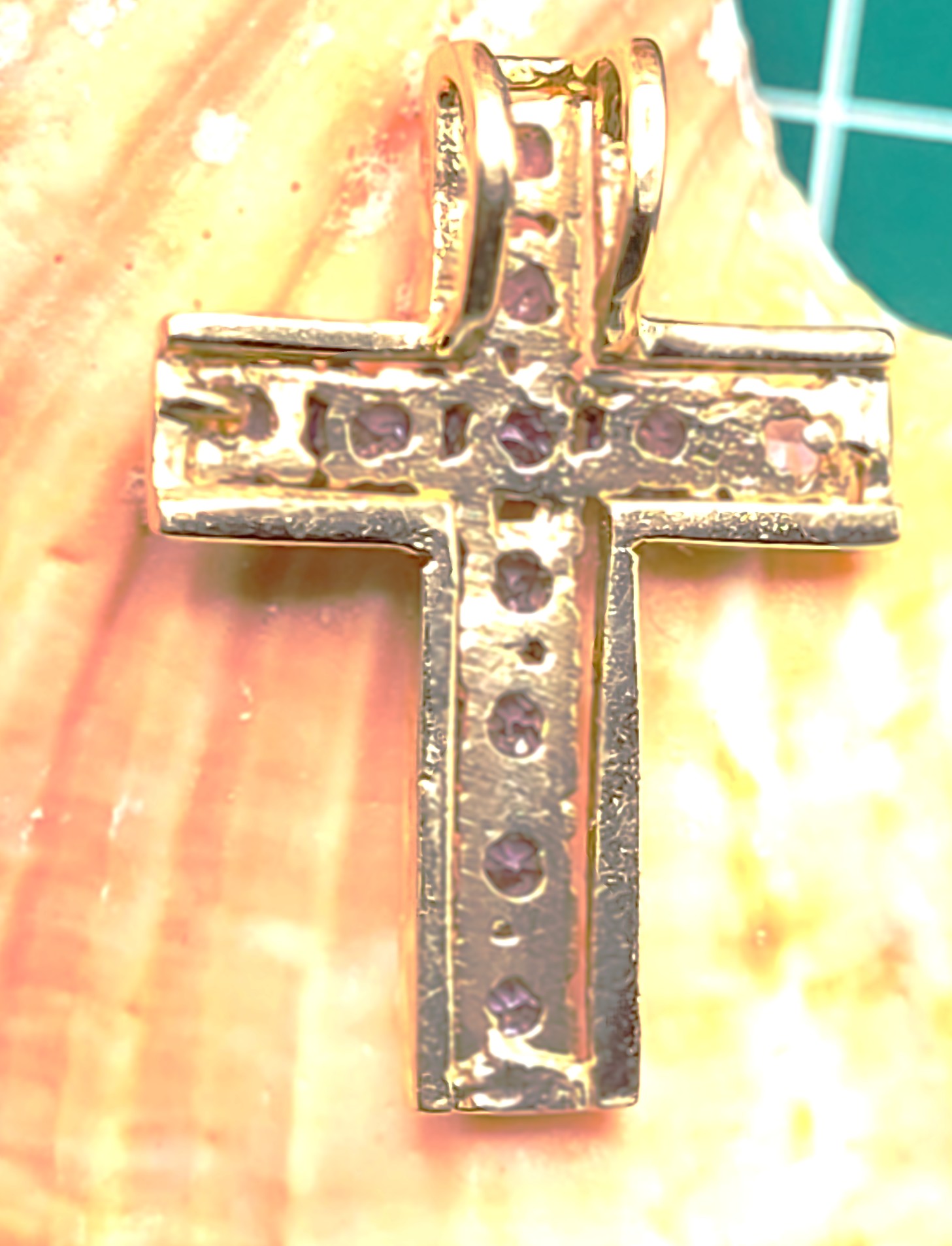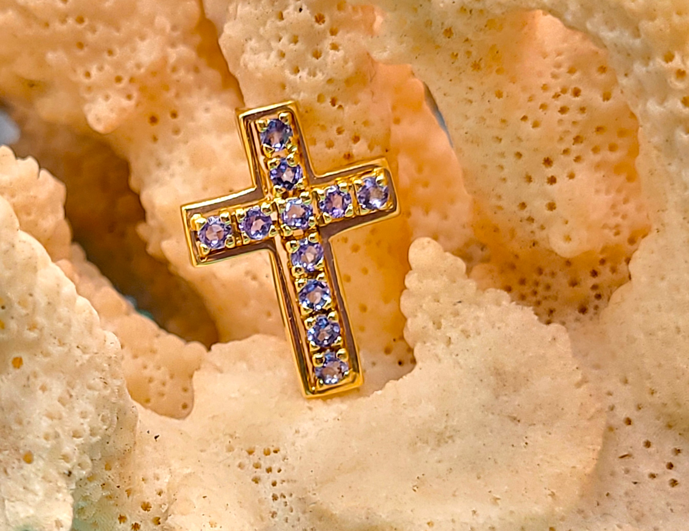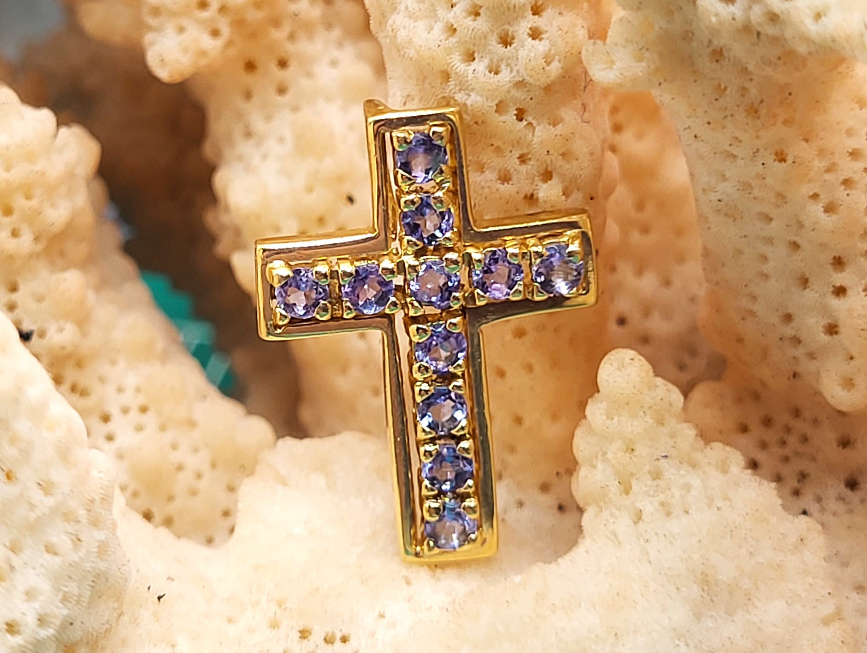 This 14 karat yellow gold pendant features .64 carats total weight of round, faceted, genuine purple tanzanite. The cross is approximately 7/8" long, 3/16" wide, and 1.75mm thick with a hidden rabbit ear bail to create a slide style pendant. The bail can accommodate up to an approximate 3mm thick chain. r storage. Admin: G11241/20btt