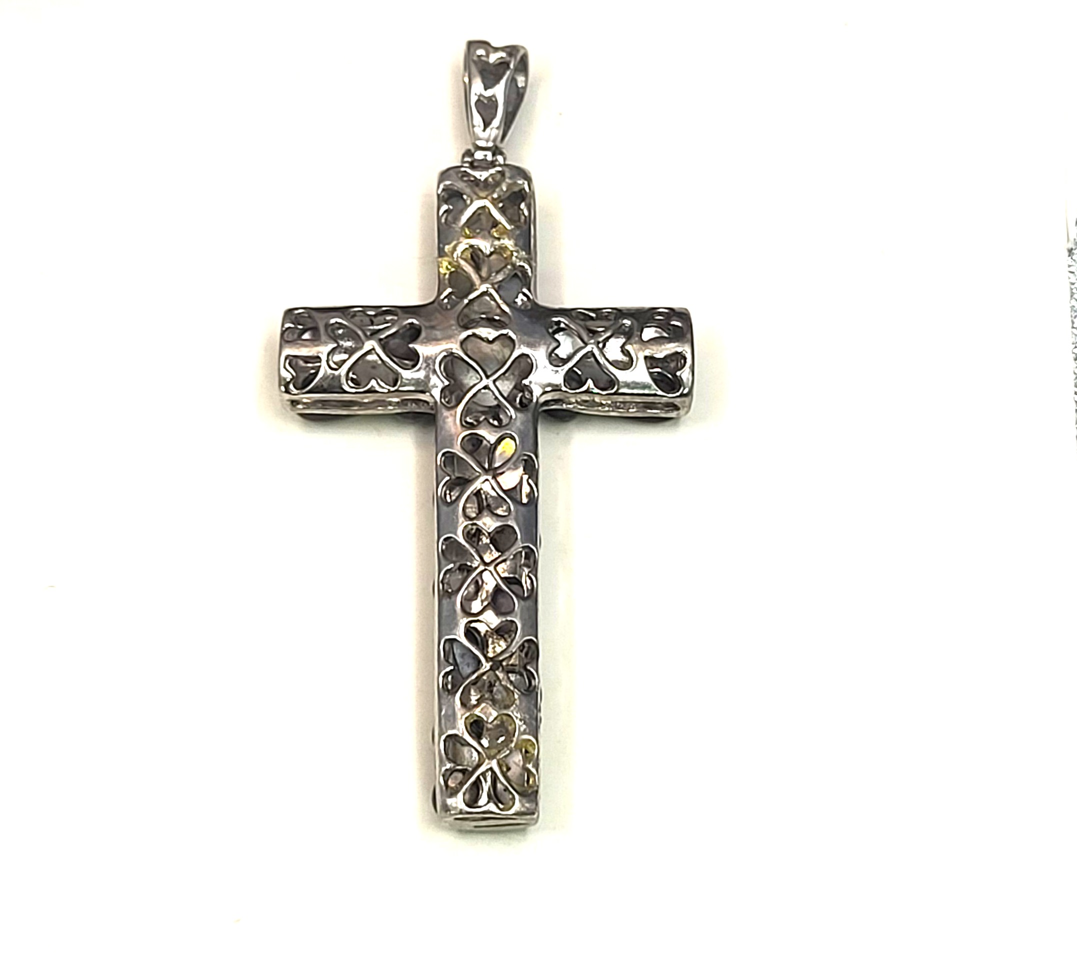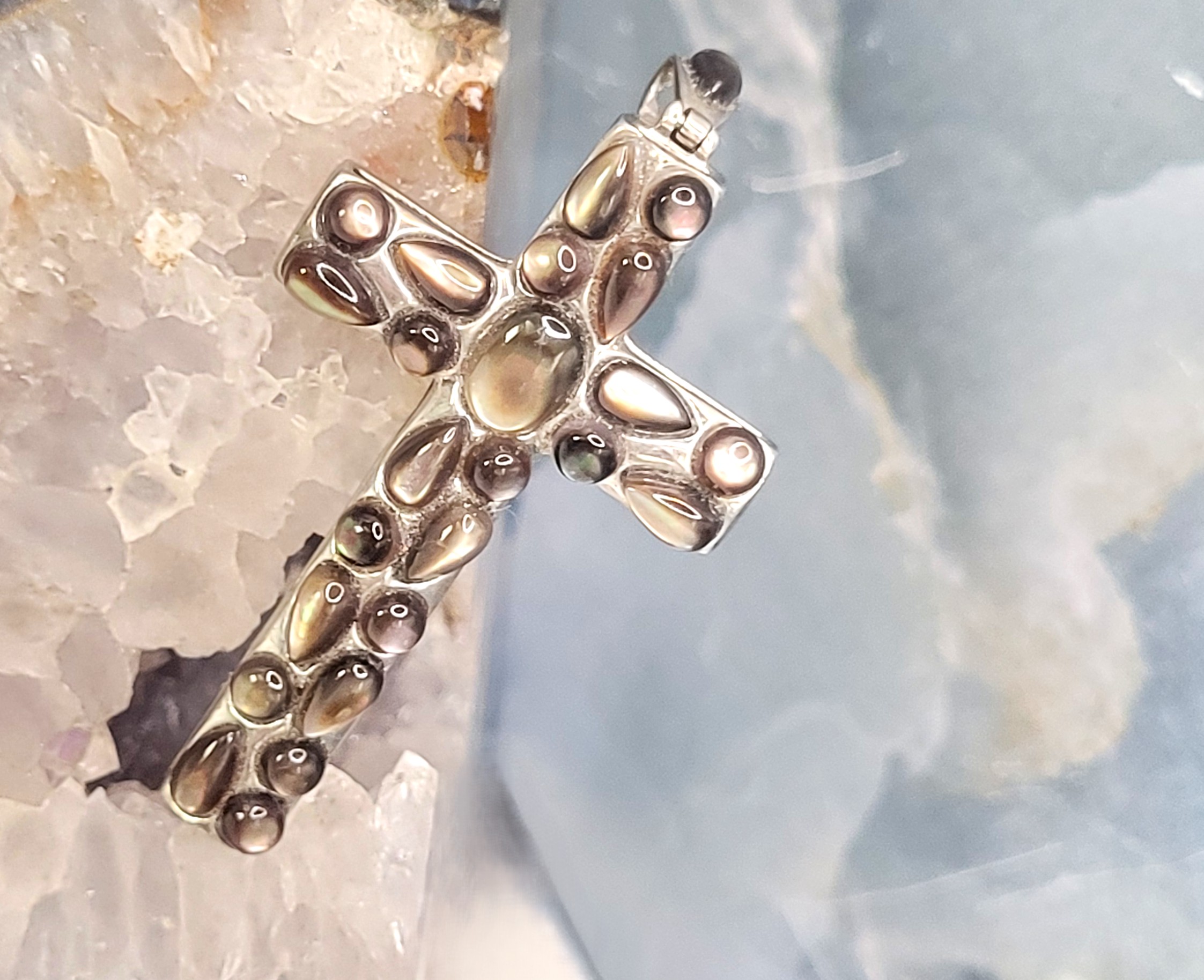 This sterlng silver pendant is quite stunning with polished cabachon abalone shells encrusting the front of the cross in a cobblestone look, whle the back of the cross is equally beautiful with a reticulated, ornate back gallery. The bail is decorated with a cut-out heart on the back and a pear-shaped abalone cabochon on the frong. The bail is attached to the cross with a hinge, so it folds forward and backward and can accommodate an approximate 3mm wide chain. It weighs 6.56 grams. AdminCode: KBJS/bg