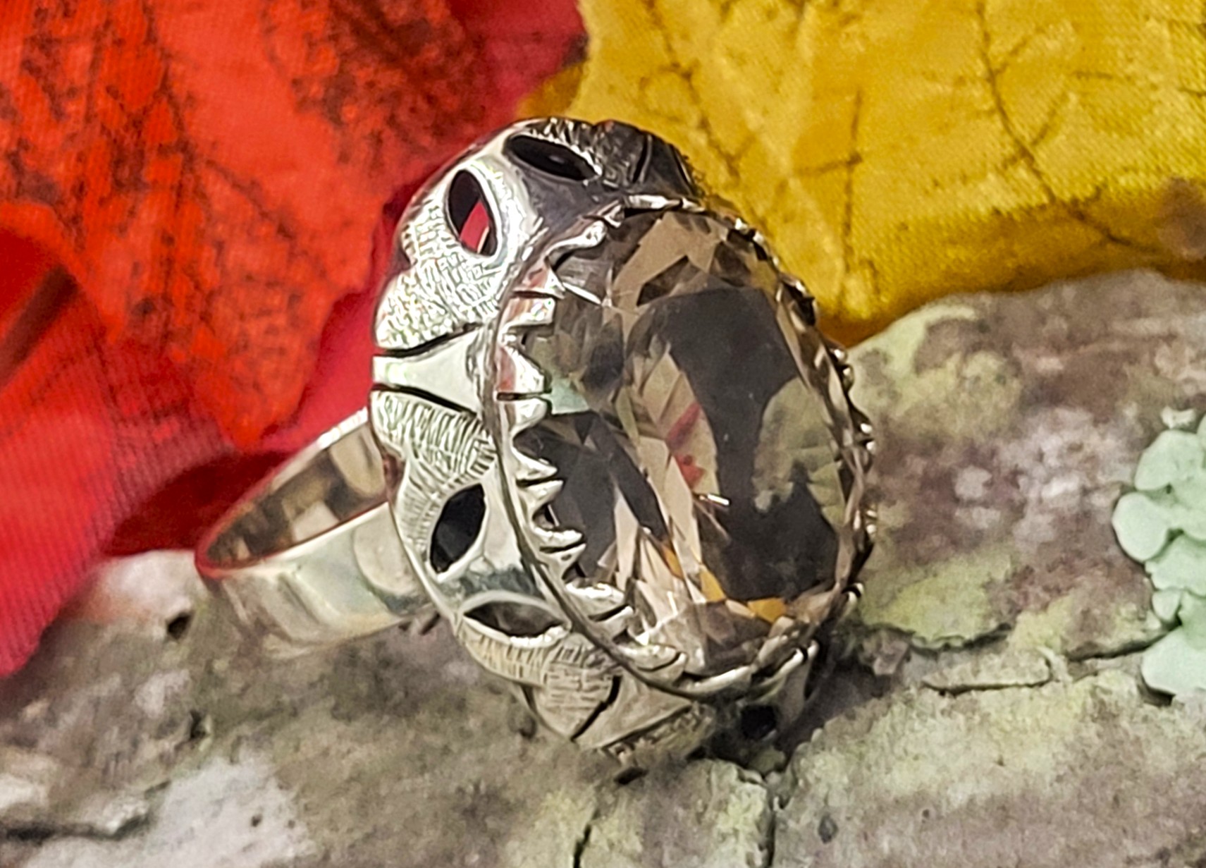 This is a remarkable example of mid-century modern jewelry reflecting the Space Age era. According to the manager of the estate from whence this item came, it is believed the artisan who crafted the ring, intended it to represent a spaceship, and that it was made prior to the moon landing in 1969. It is beautifully crafted in sterling silver with an artistic frame exhibiting a design undulated between a textured and polished finish on top and reticulated designs below. It features a gorgeous 10.00 carat smoky quartz that is crown-set with an open gallery. The ring is US size 7 and the shank is a firm 4.40 mm wide. See below for sizing options and other details. This ring is believed to be circa early 1960’s.AdminCode: Es23/59