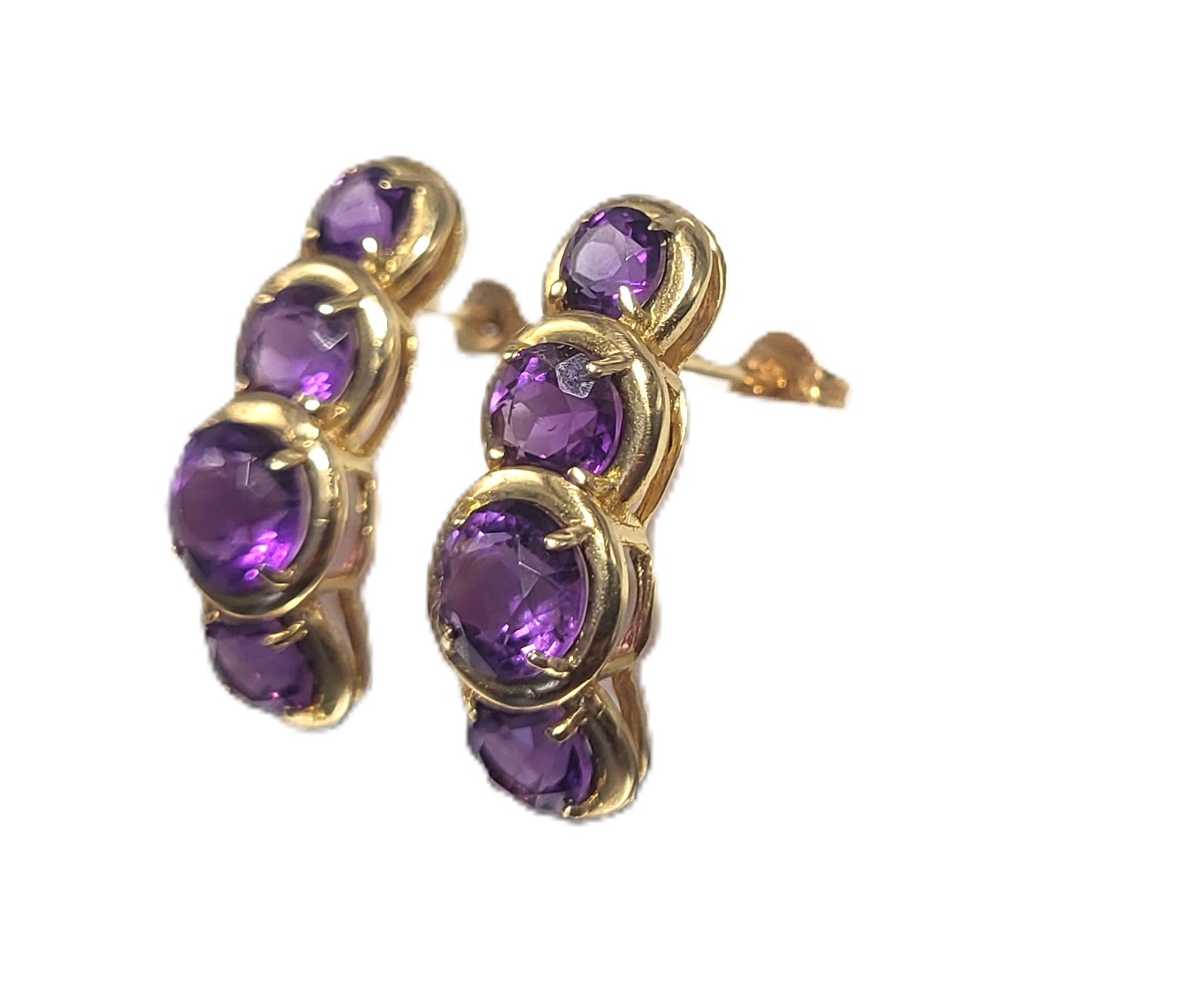 These 14 karat yellow gold earrings feature approximately 4.00 carats total weight of round, faceted genuine amethysts, The earrings hang approximately7/8" and attach to the earlobes with posts and friction backs, This is a brand new item that has been held in back stock. It is in excellent condition, but may have minor signs of storage, such as fine scratches or patina. Admin Code: 33109/5bra