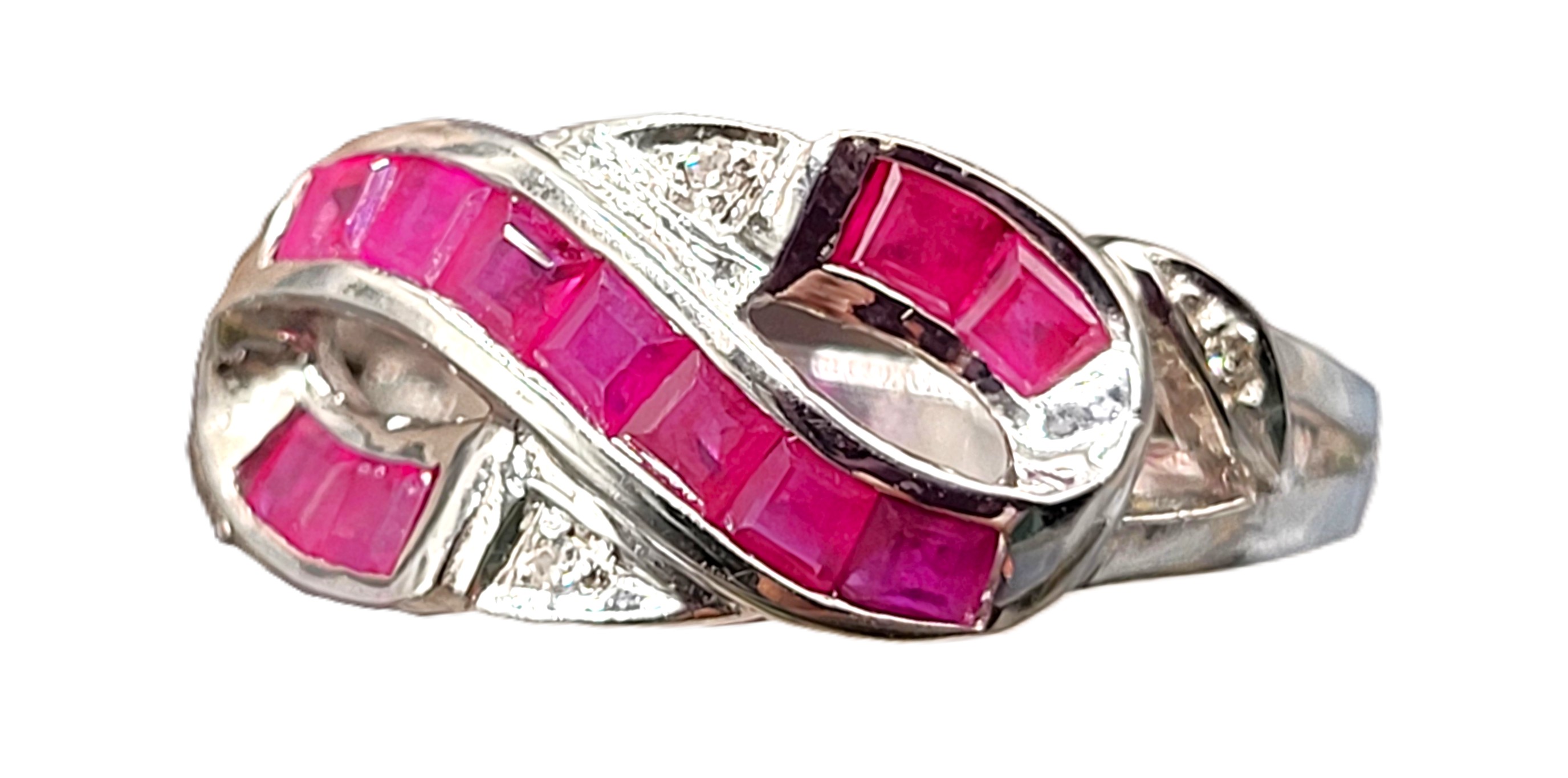 This 14 karat white gold ring features approximately .75 carats total weight of square-cut, channel- and invisible-set, genuine rubies with a ribbon-like flow in an infinity symbol pattern. There are four round, faceted accent diamonds for additional sparkle. This ring is US size 7. See sizing options and other information below. Please contact Bidfair Fine Jewelry for sizing details.