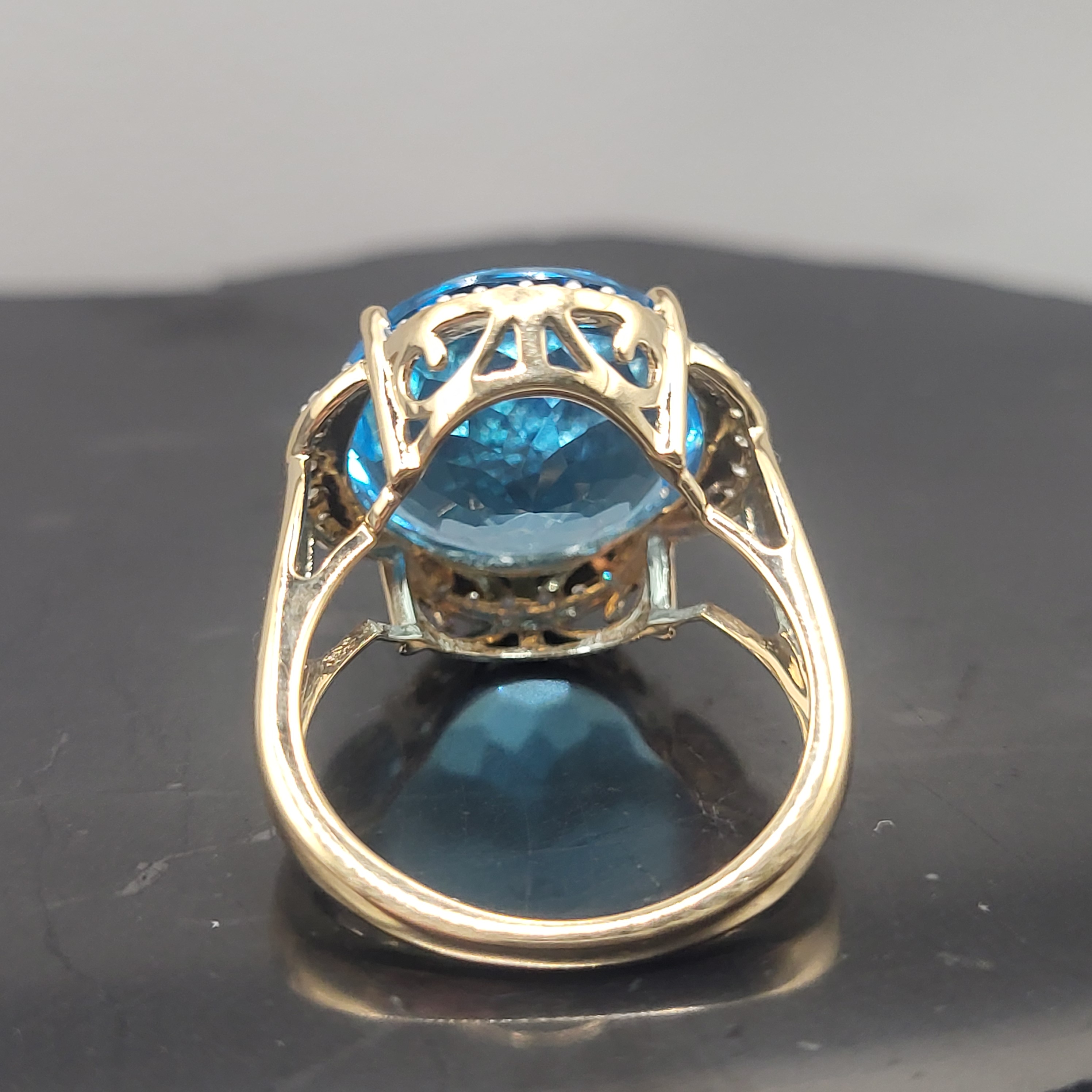The color of Swiss Blue Topaz is said to be the ideal mixture of soft and dramatic (rosiecjewelry website). This 14 karat yellow gold ring leans more to the dramatic with the 12.50 carat round, faceted Swiss Blue Topaz that is prong-set amongst .19 carats total weight in the petal-like, floating halos around the center. Admin: Q5743/22-gnp