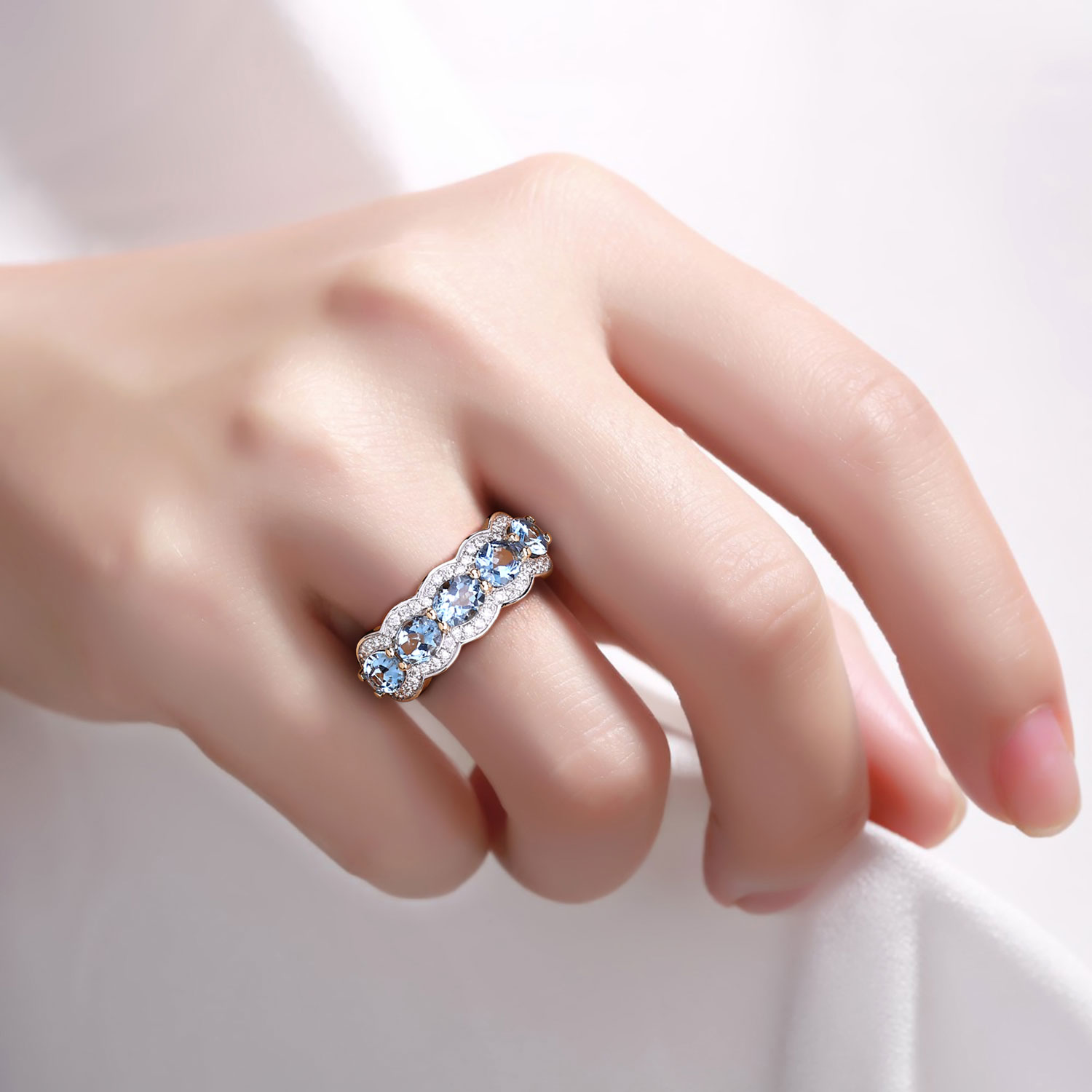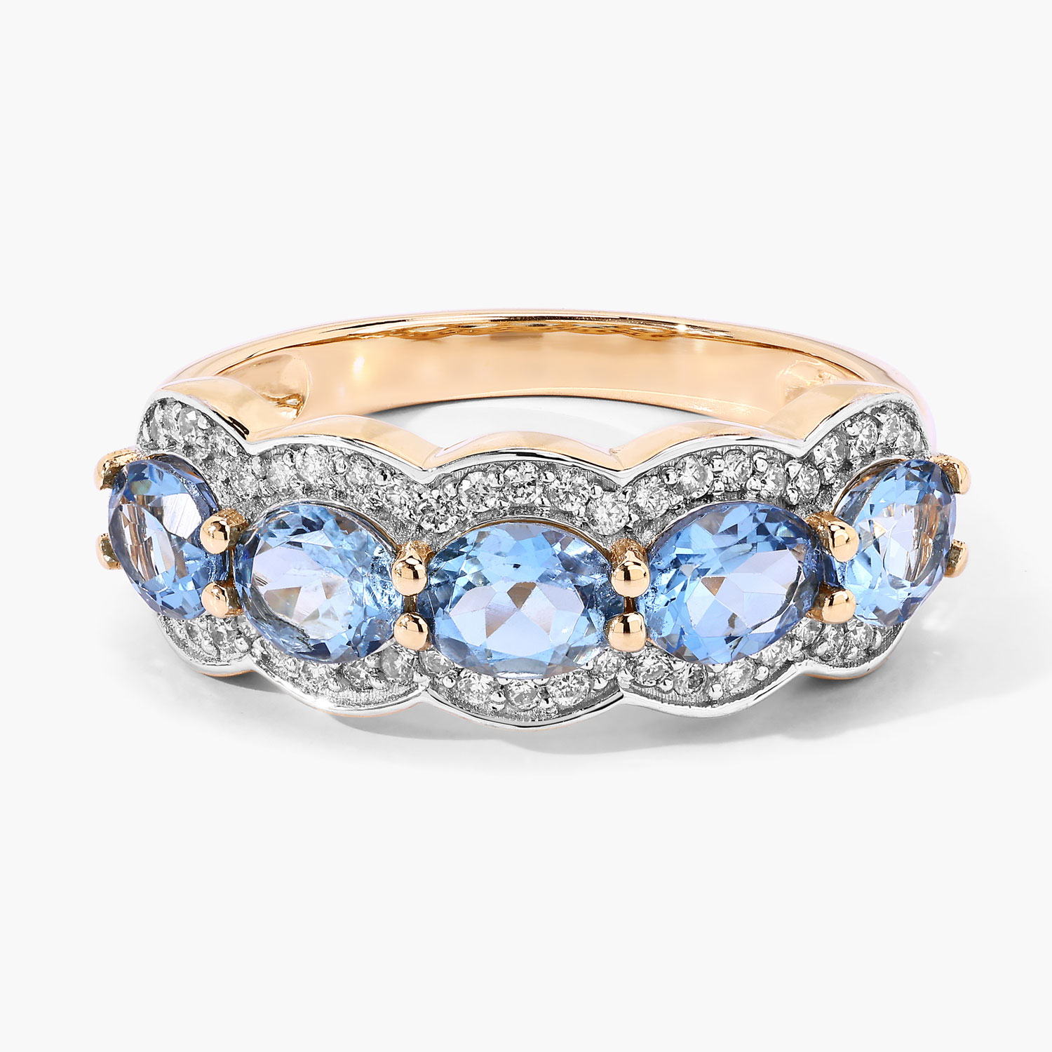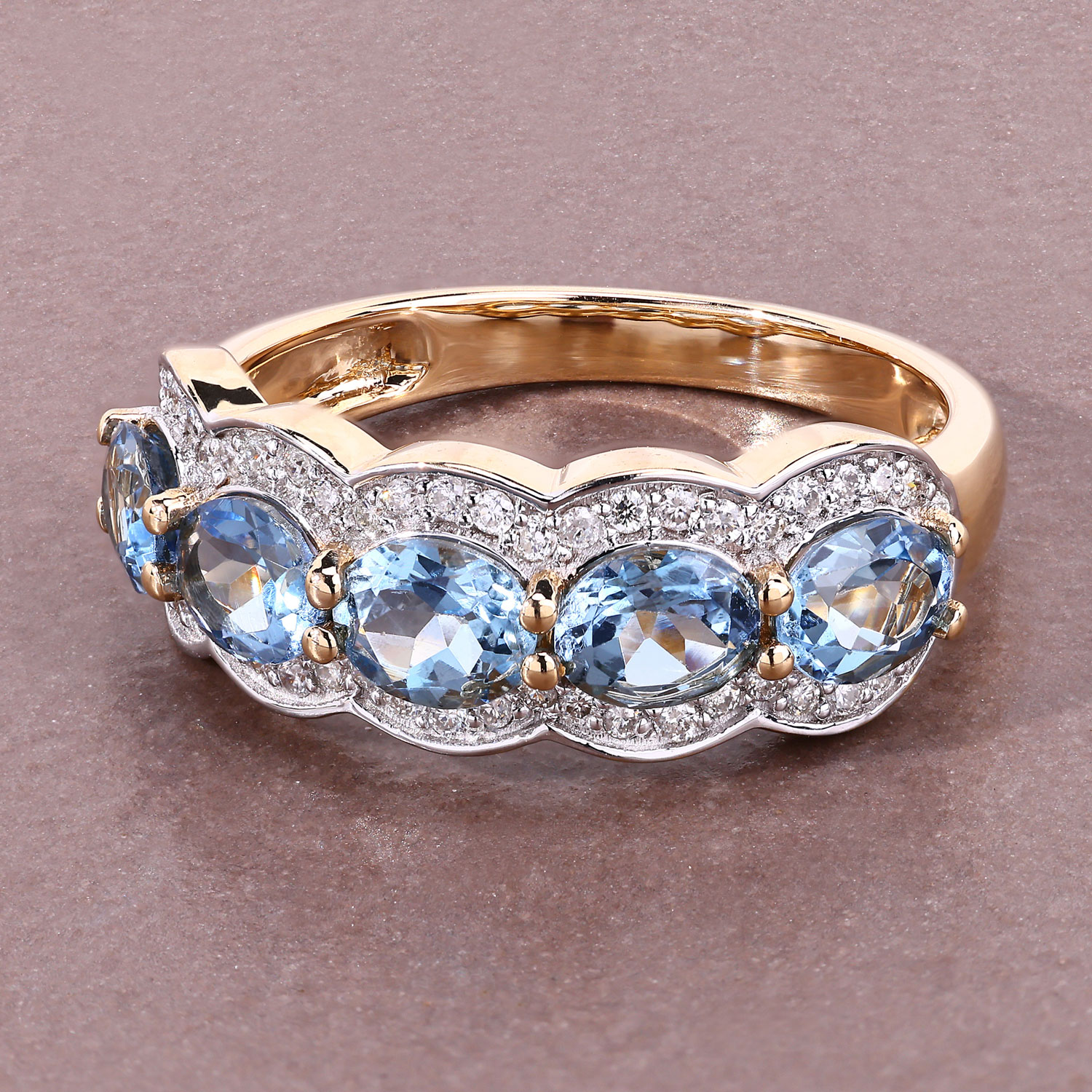 This 14 karat yellow gold ring features 1.35 carats total weight of oval-cut, genuine aquamarines. The 5x4mm gemstones are prong-set in a row, between scalloped borders that are encrusted with .24 carats total weight of round, brilliant-cut, H-I color, I1 clarity, genuine diamonds. What better way is there to recognize your accomplishments over the years! The ring is US size 7. Sizing details and other information are below. AdminCode: NQnis/bboe2
