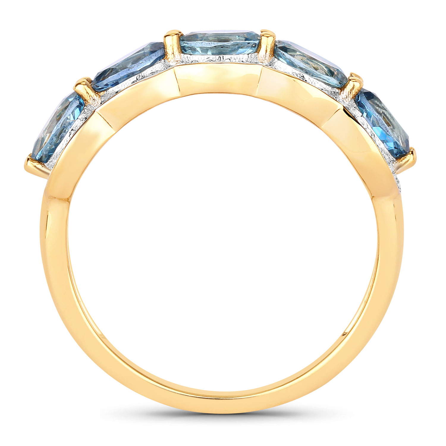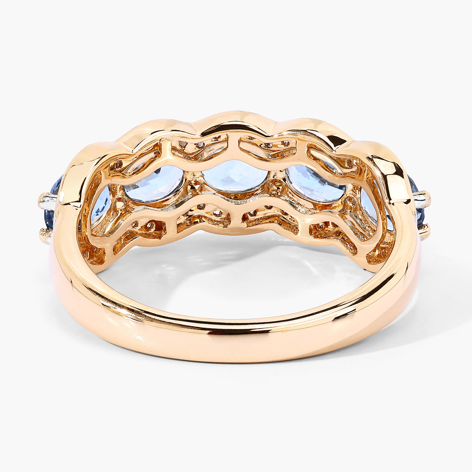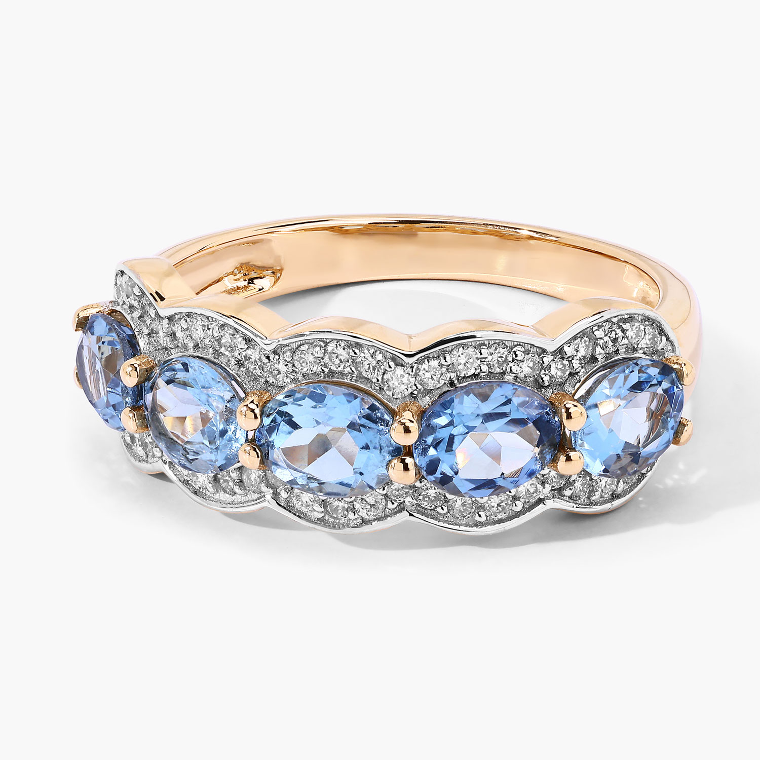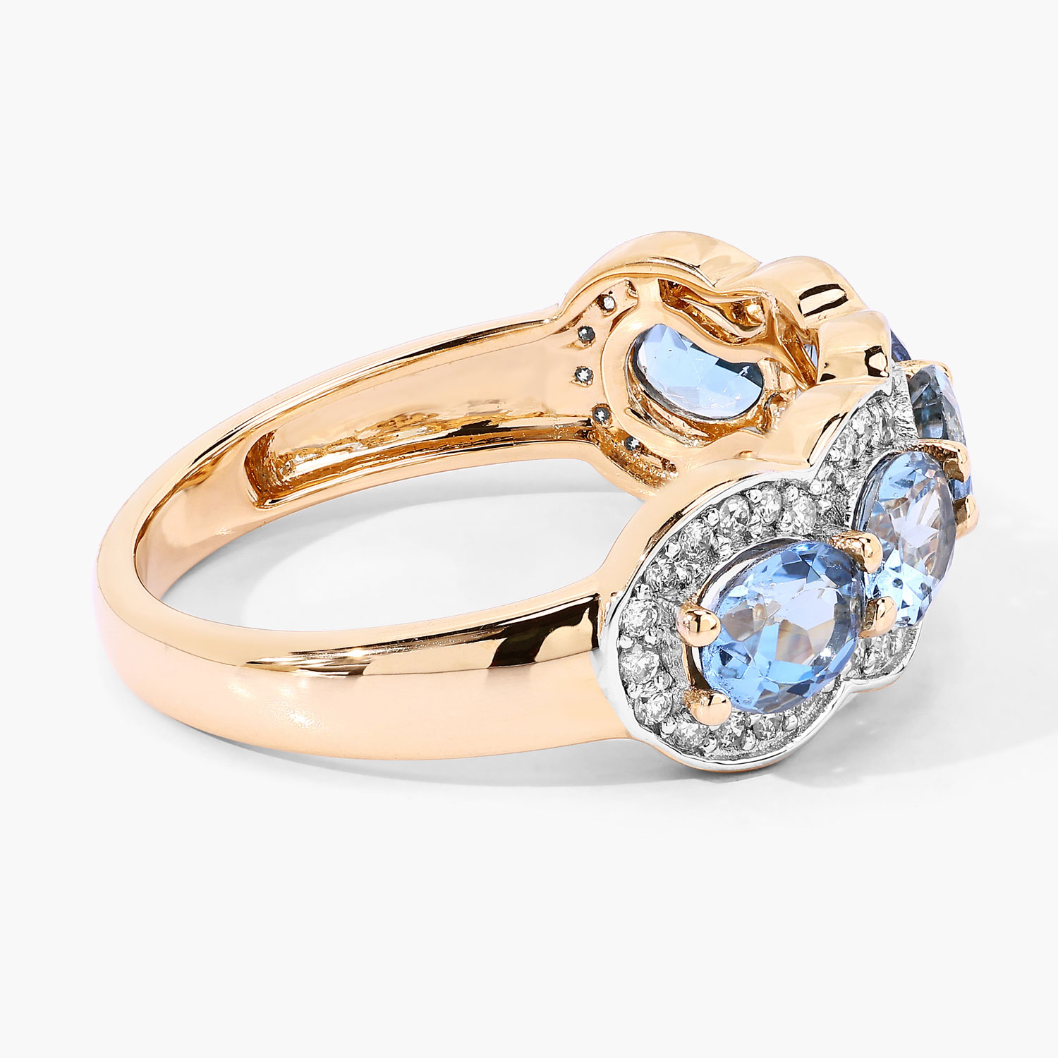 This 14 karat yellow gold ring features 1.35 carats total weight of oval-cut, genuine aquamarines. The 5x4mm gemstones are prong-set in a row, between scalloped borders that are encrusted with .24 carats total weight of round, brilliant-cut, H-I color, I1 clarity, genuine diamonds. What better way is there to recognize your accomplishments over the years! The ring is US size 7. Sizing details and other information are below. AdminCode: NQnis/bboe2