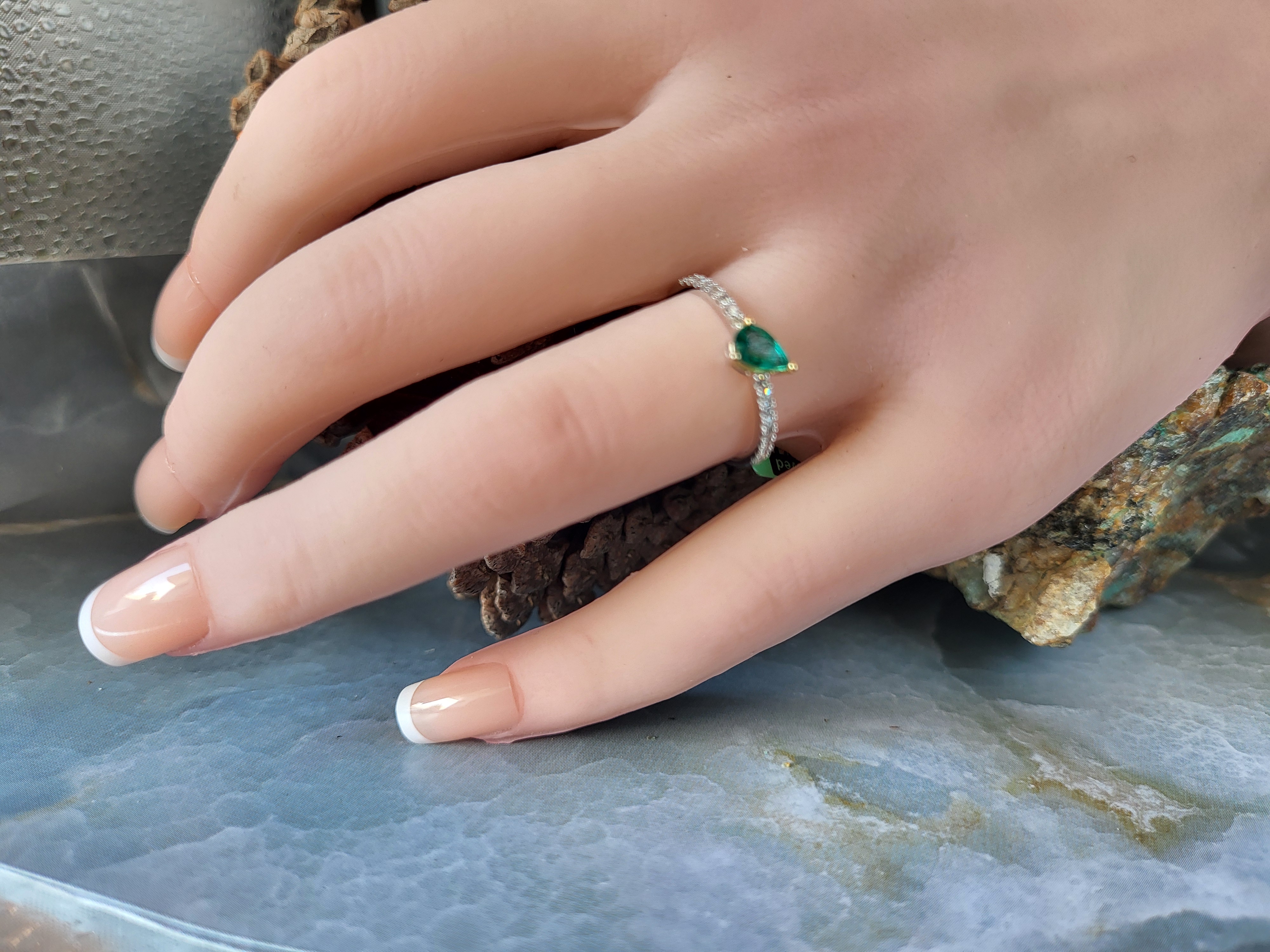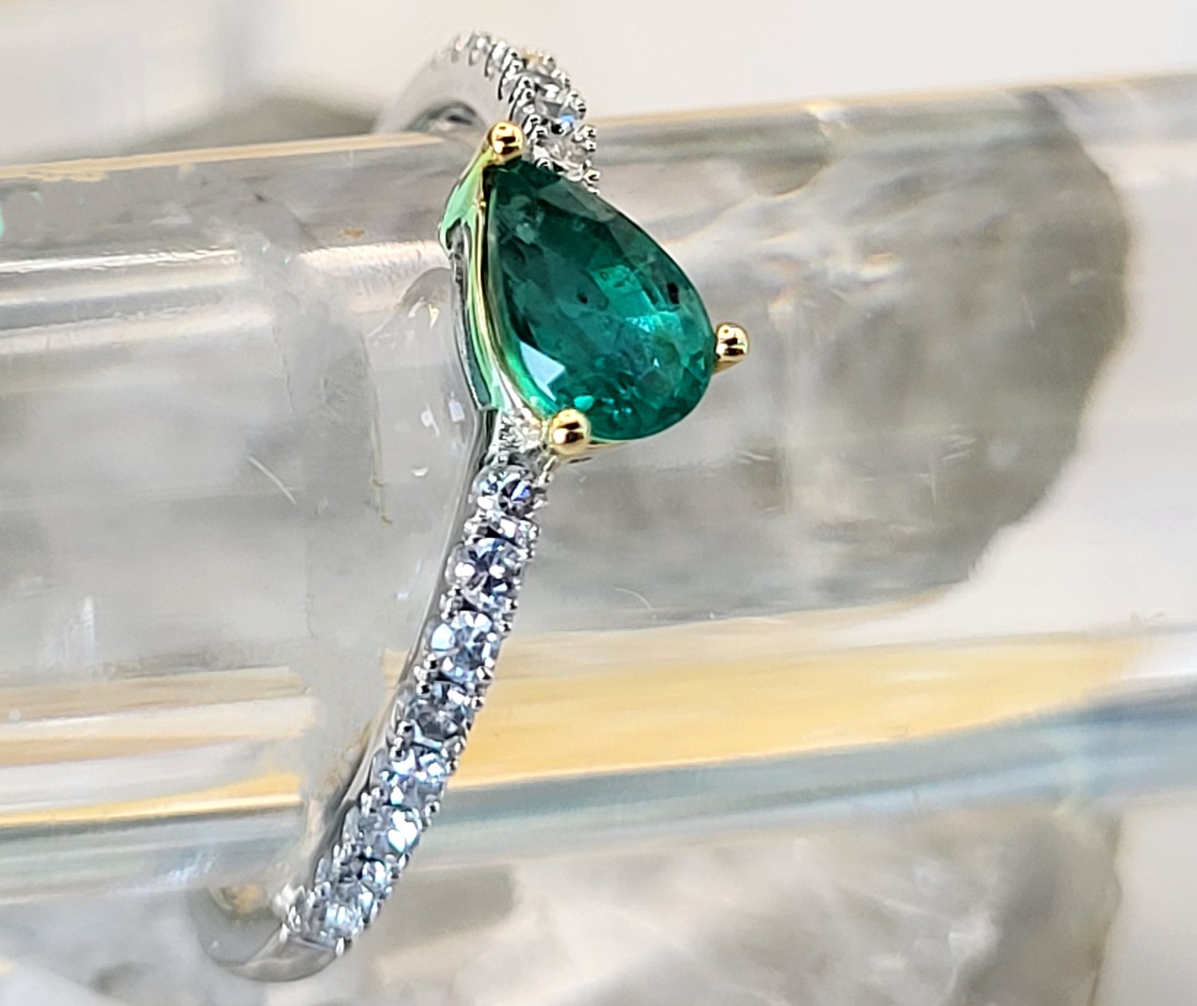 A vivid 6x4mm pear-cut genuine emerald glows at the heart of this 14K white gold ring, cradled in yellow gold claw prongs for a striking contrast. The band is adorned with round, faceted natural diamonds totaling approximately 0.15 carats, adding a delicate shimmer to the sleek silhouette. Elegant and timeless, this size 7 ring blends classic gemstone beauty with modern craftsmanship. Read below for sizing options and other important information. 1.67g – AdminCode:6282/25-irr
